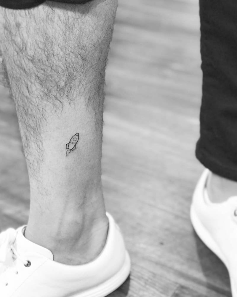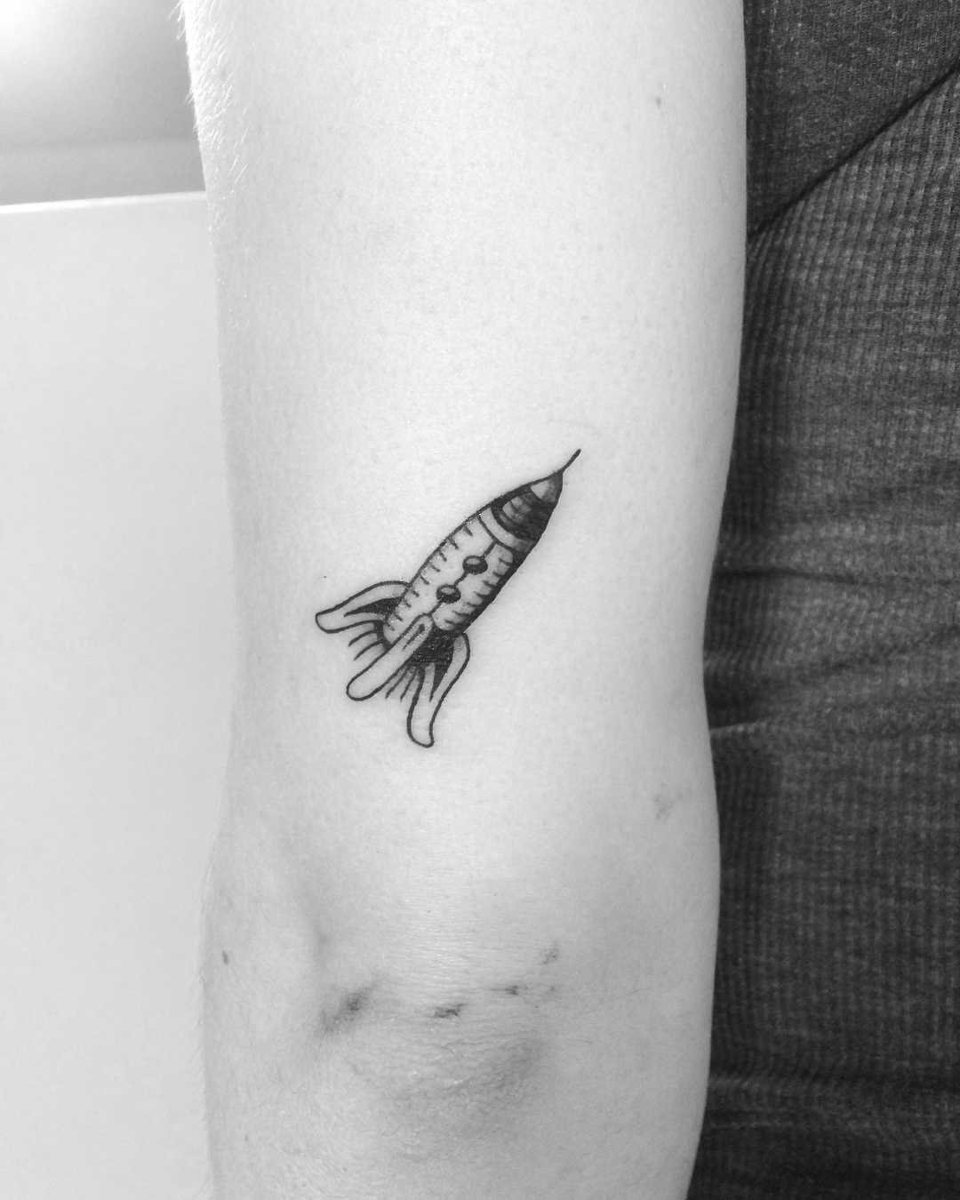 Eine Rakete wird von vielen Menschen mit männlicher Energie assoziiert und symbolisiert somit Männlichkeit. Daher ist diese Raketen Tattoo mehr ein männliches Körperbild.