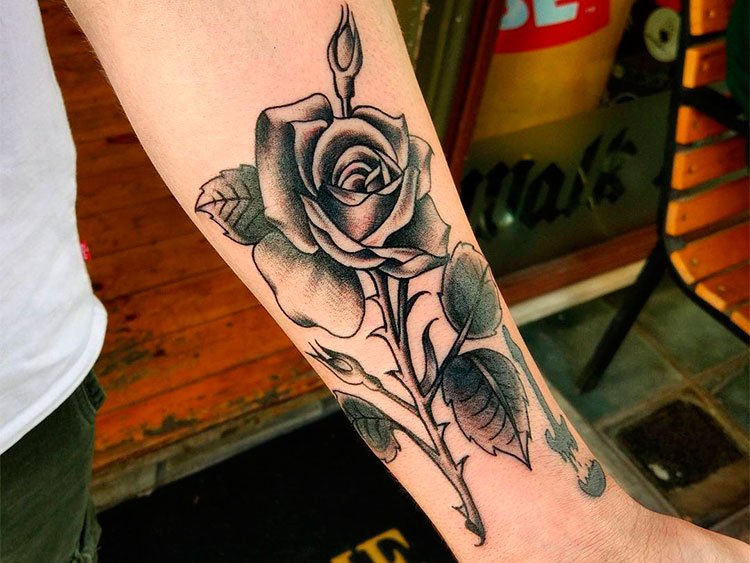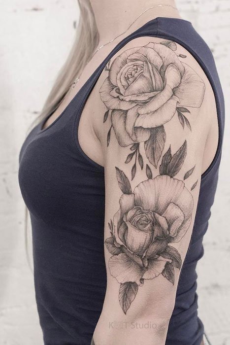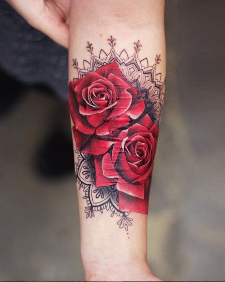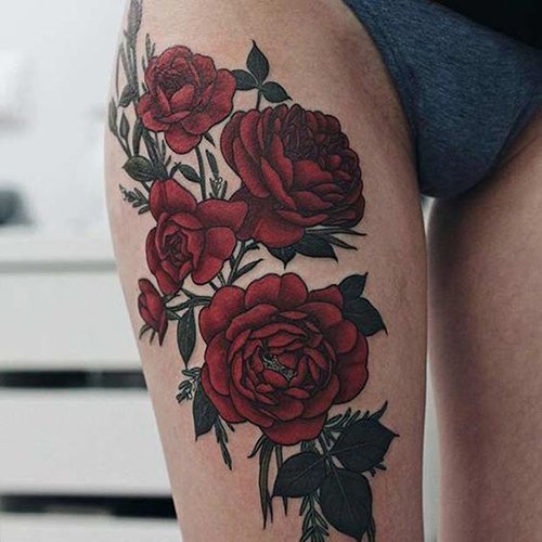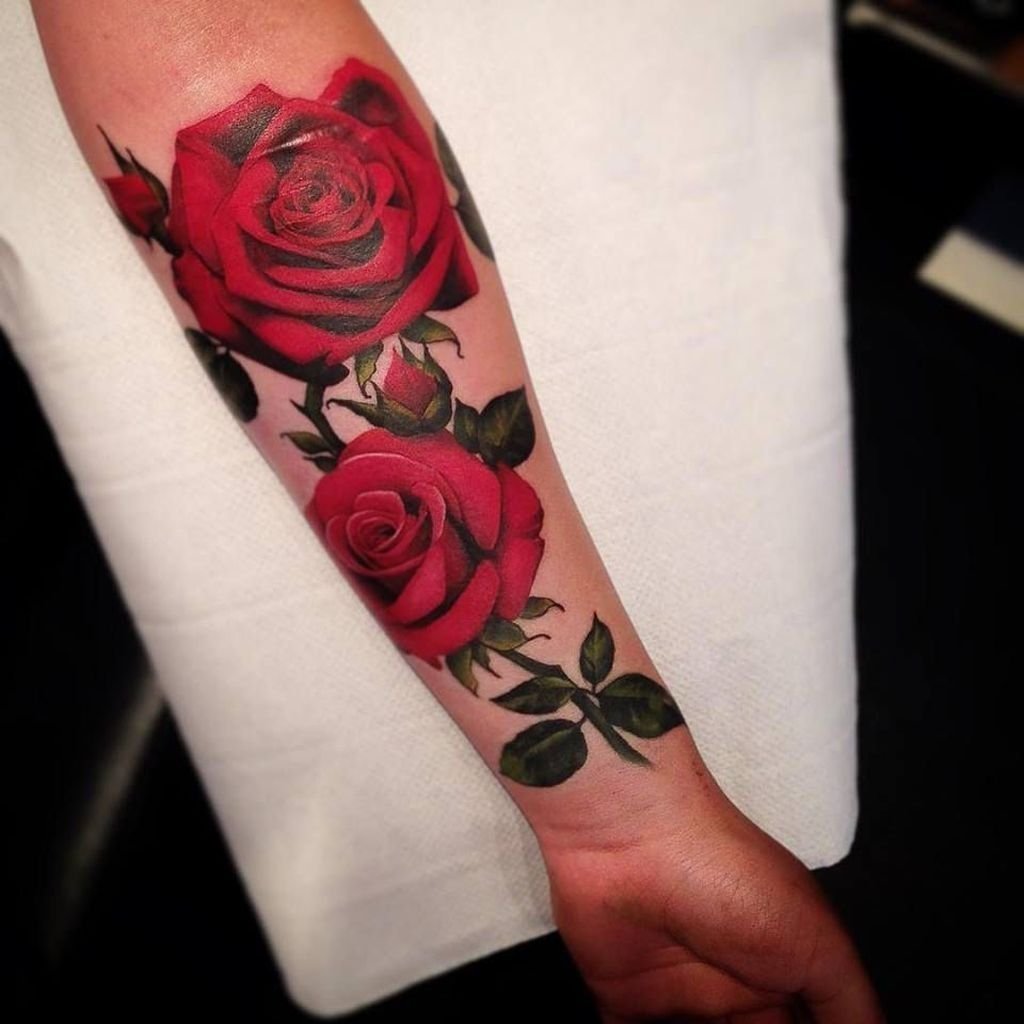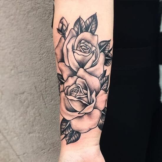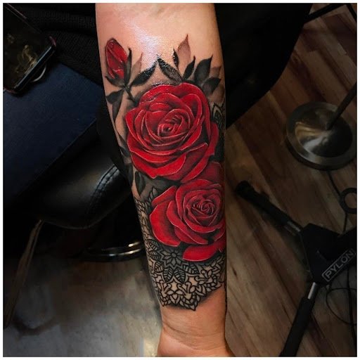 Das Rosen-Tattoo kann eine einzelne Rose, einen Blumenstrauß oder eine Kombination aus verschiedenen Bildern enthalten. Es kann die Knospe der Blume selbst sein oder eine Blume in voller Länge, alles hängt von den Wünschen des Kunden ab.