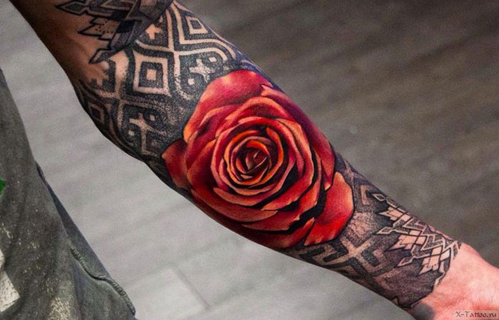 Die Hauptinterpretation des Bildes ist Schönheit, sowohl innere als auch äußere. Die Rose wird auch mit dem großen Gefühl der Liebe assoziiert. Das Rosen-Tattoo mit Dornen deutet darauf hin, dass die Liebe Opfer erfordert und manchmal Schmerzen mit sich bringt. Auch ein solches Bild spricht von der Schönheit der inneren Welt des Menschen. Das Bild einer Rose ohne Dornen beschreibt die äußere Schönheit des Besitzers, kann seine Liebe zeigen.