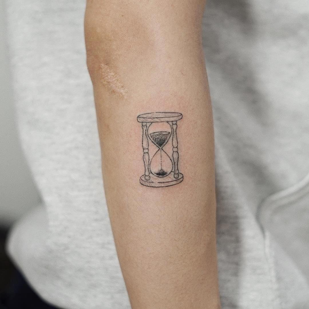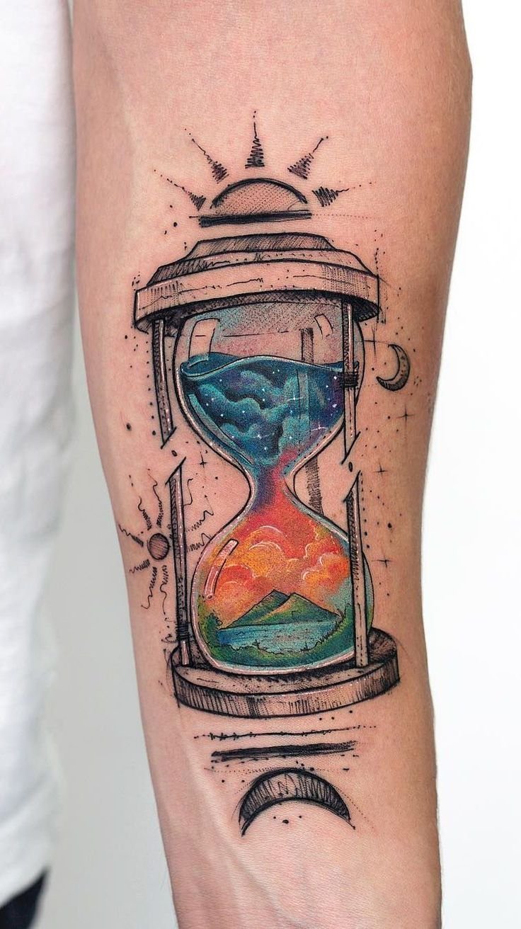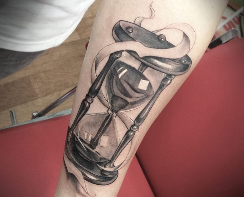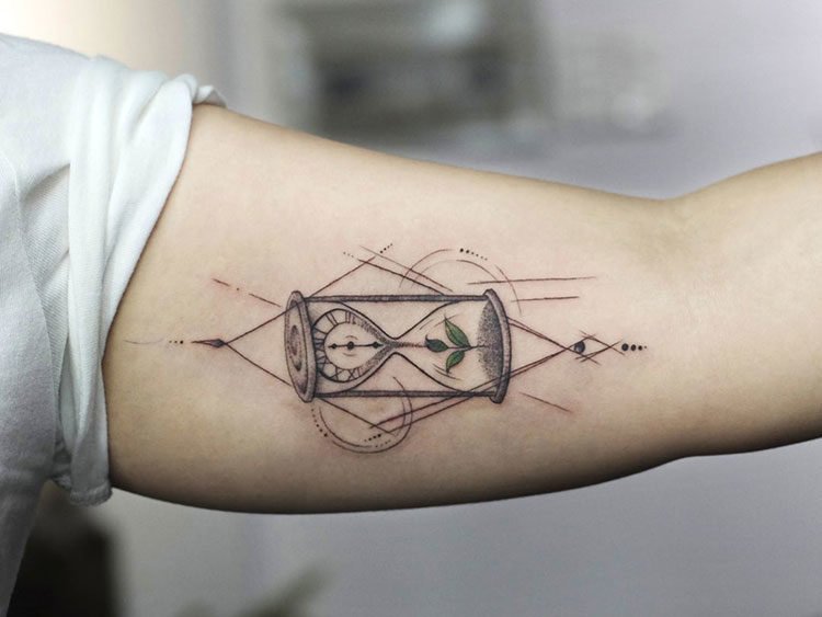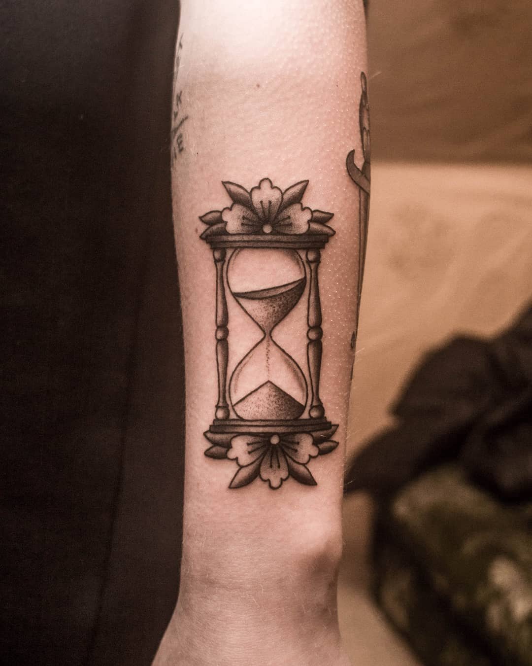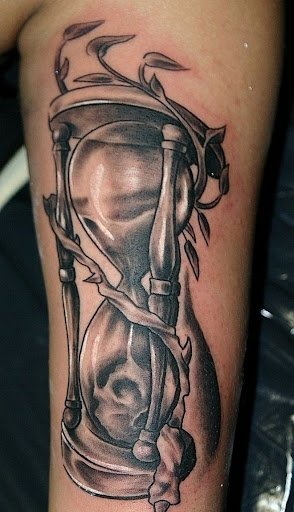 In der Regel ist ein Sanduhr-Tattoo immer mit Zeit verbunden, egal welche zusätzlichen Elemente abgebildet sind.