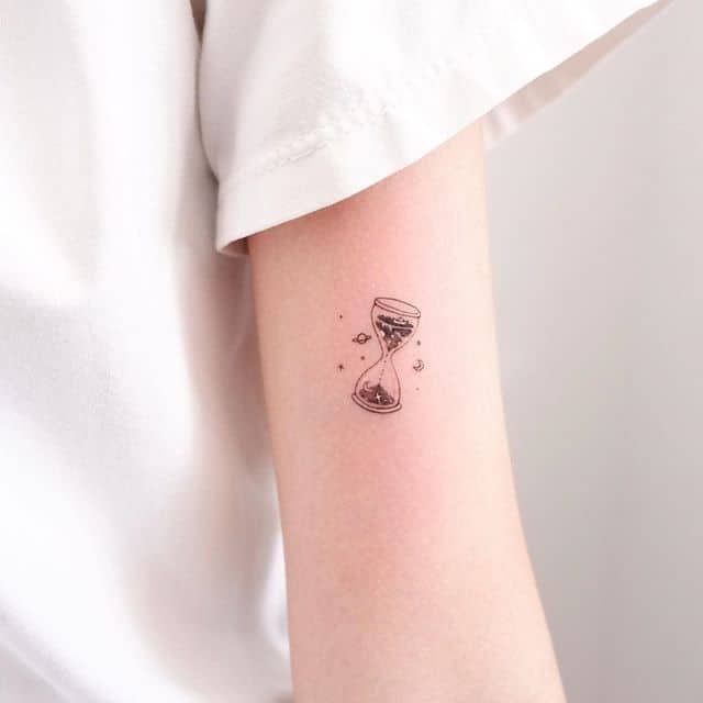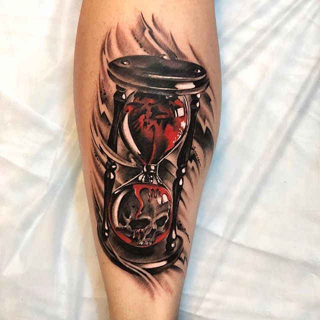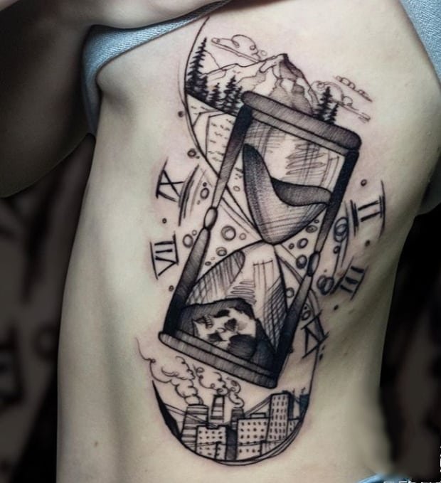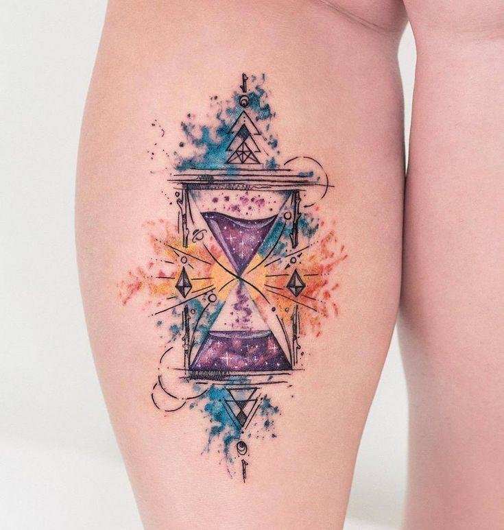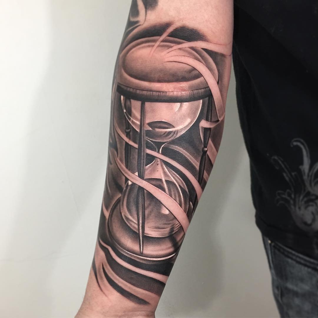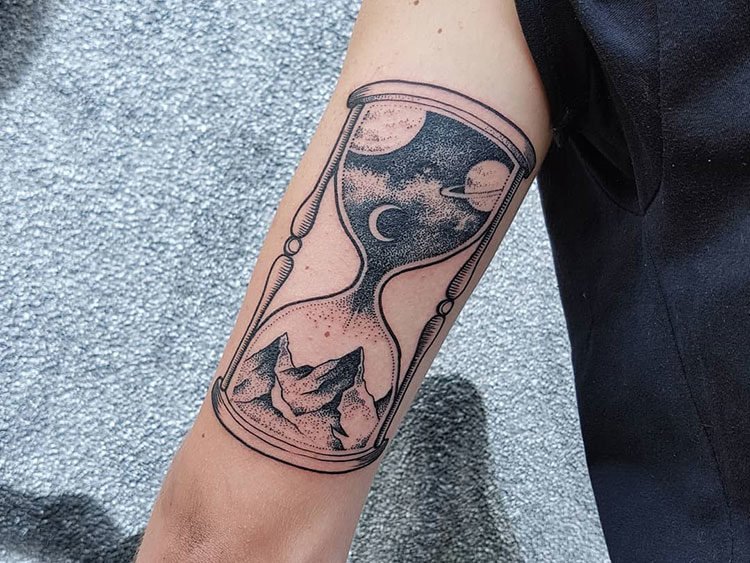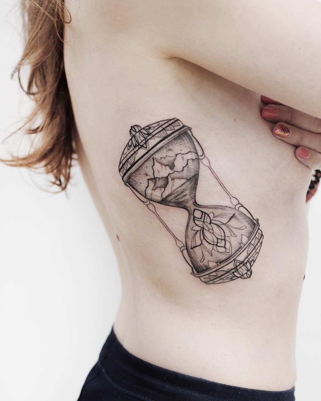 In der Regel ist ein Sanduhr-Tattoo immer mit Zeit verbunden, egal welche zusätzlichen Elemente abgebildet sind.