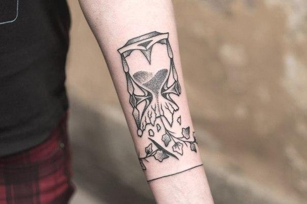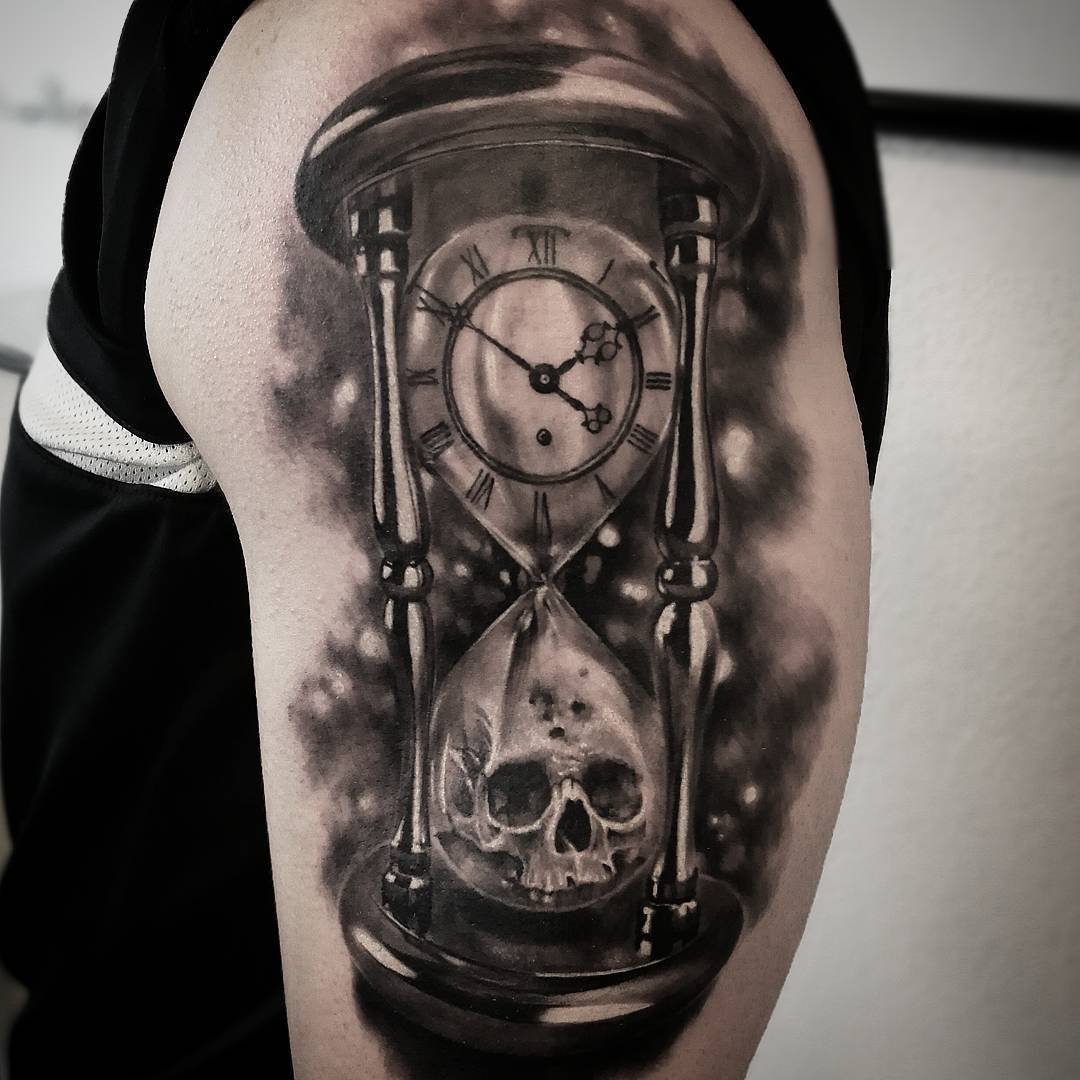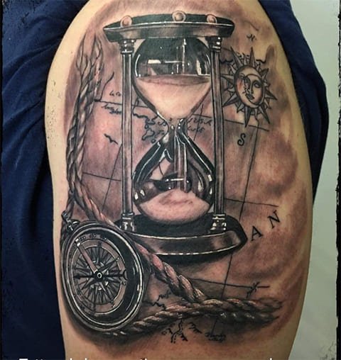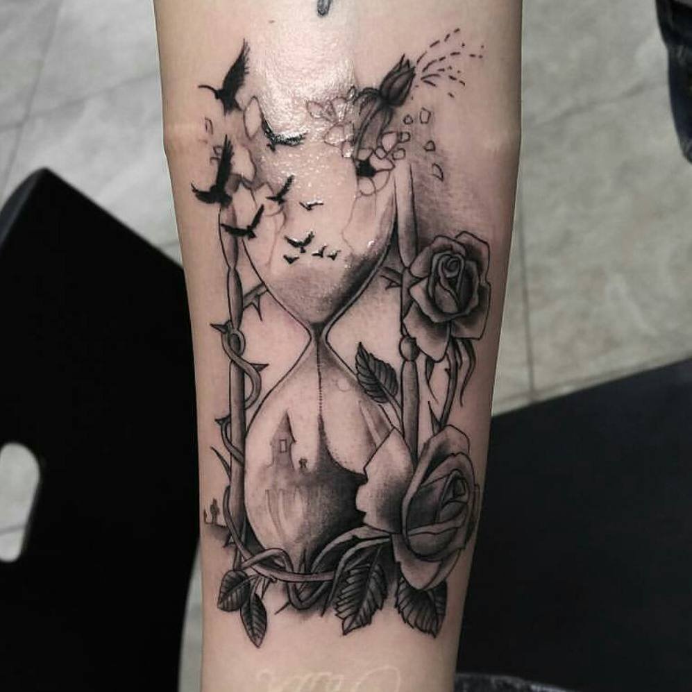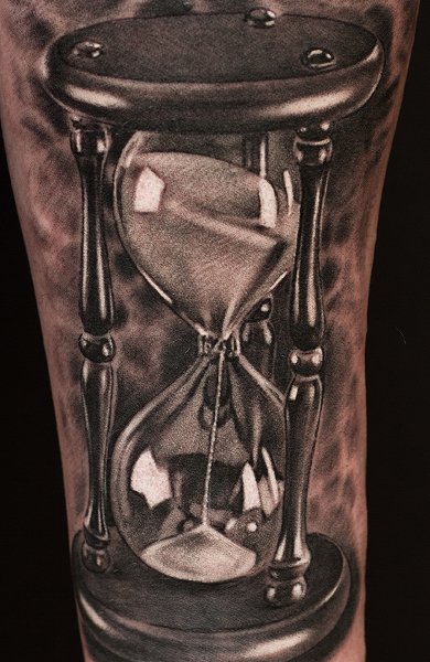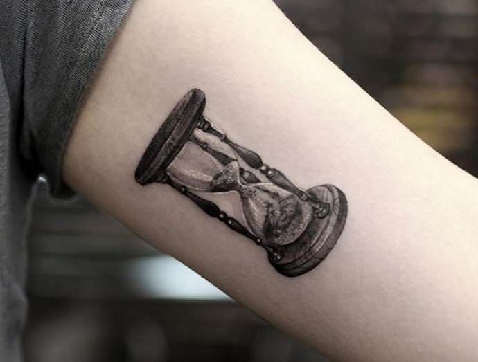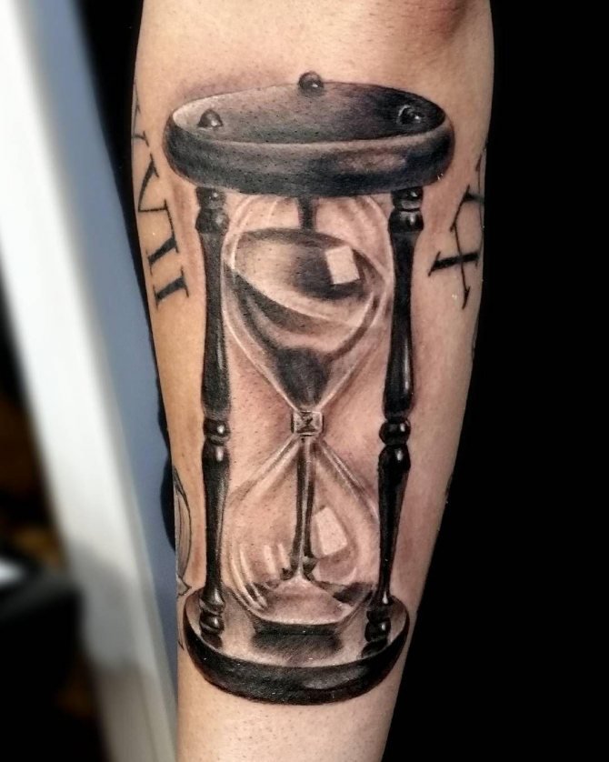 Die effektivste Tätowierung sieht auf der Schulter, Rücken, Brust oder auf der Oberseite des Beines aus. Es kann sowohl eine farbige als auch eine Schwarz-Weiß-Komposition sein. Die Sanduhr wird als vollwertiges Tattoo und mit zusätzlichen Elementen dargestellt. Dieses Bild kann zum Beispiel durch eine Inschrift oder ein anderes Element (Vögel, Herz, Totenkopf usw.) ergänzt werden, je nach Wunsch des Kunden.