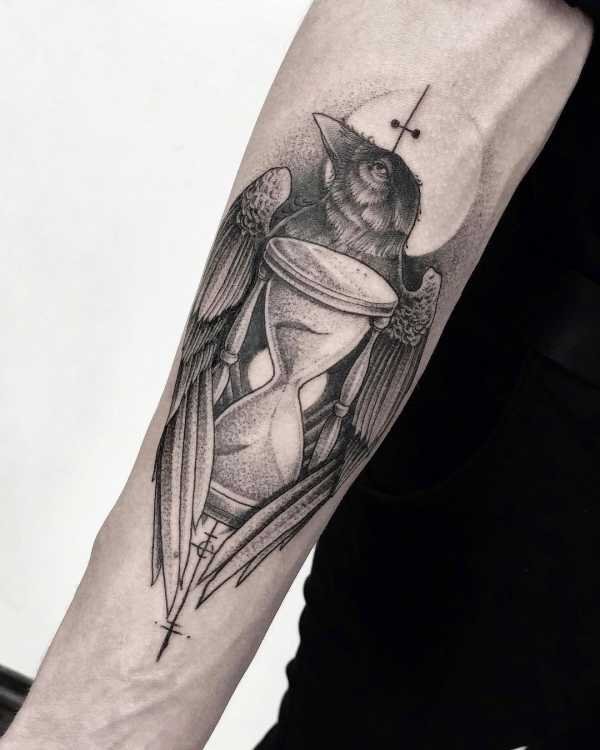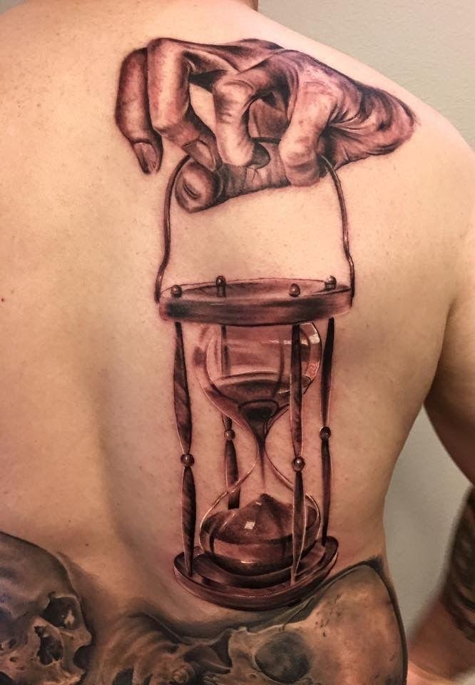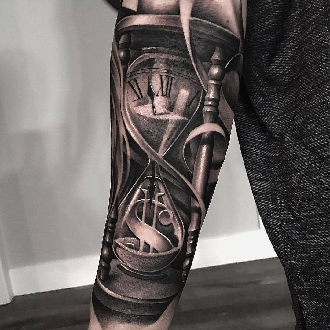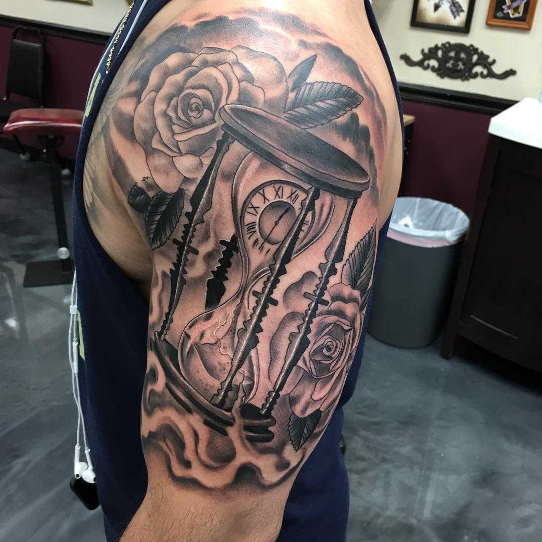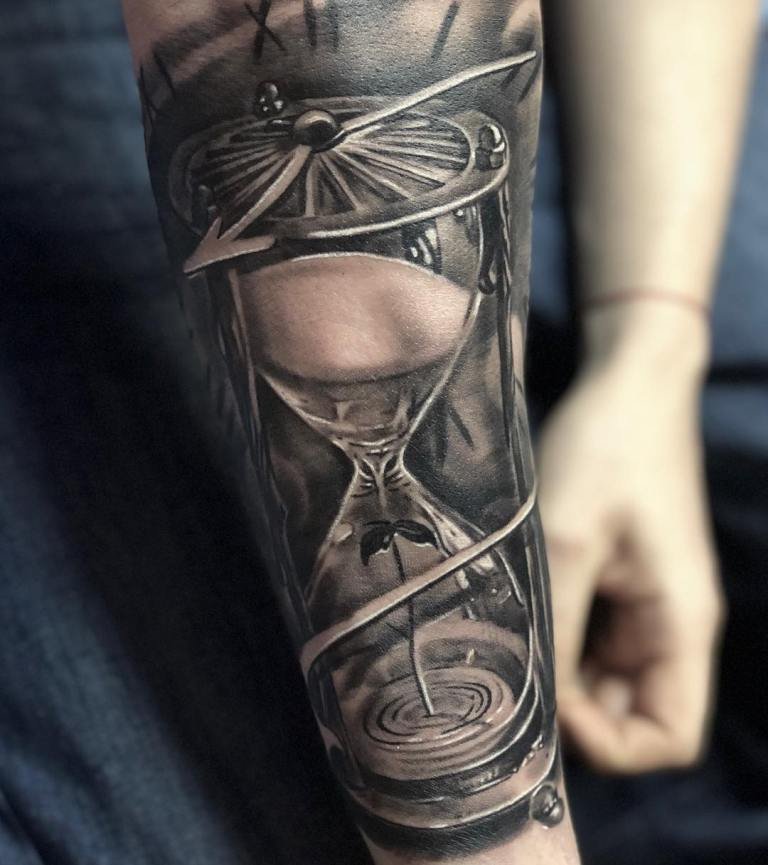 Die effektivste Tätowierung sieht auf der Schulter, Rücken, Brust oder auf der Oberseite des Beines aus. Es kann sowohl eine farbige als auch eine Schwarz-Weiß-Komposition sein. Die Sanduhr wird als vollwertiges Tattoo und mit zusätzlichen Elementen dargestellt. Dieses Bild kann zum Beispiel durch eine Inschrift oder ein anderes Element (Vögel, Herz, Totenkopf usw.) ergänzt werden, je nach Wunsch des Kunden.