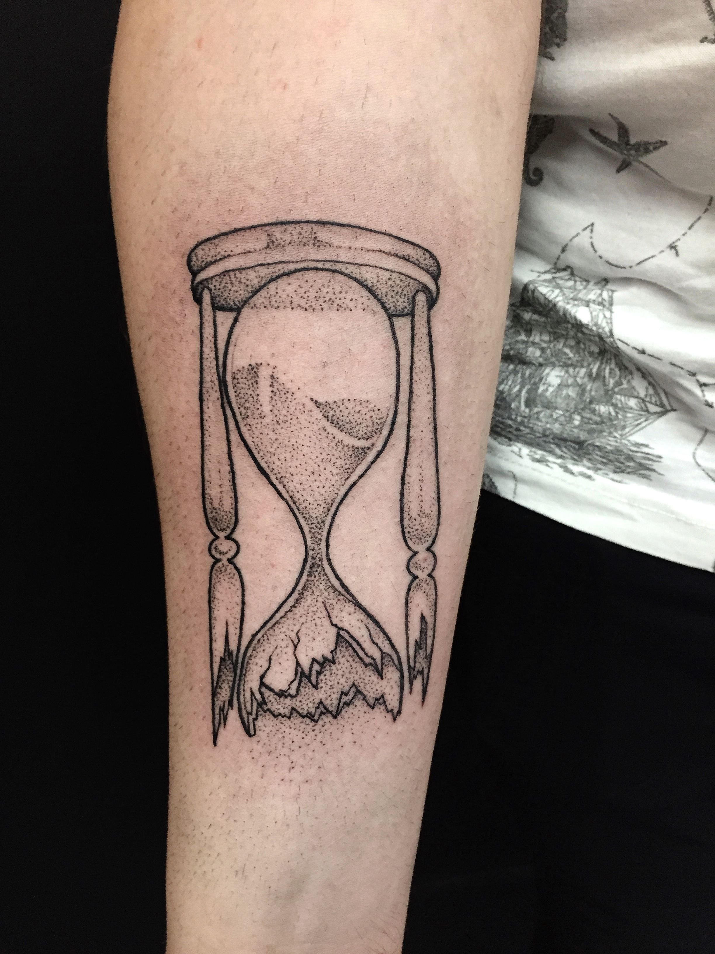 Häufig ist auch das Bild einer kaputten Uhr zu sehen. Häufig sieht man auch Bilder von zerbrochenen Uhren, die für Traurigkeit und Frustration stehen, meist in Verbindung mit der Vergänglichkeit des Lebens. Oder die Tätowierung deutet darauf hin, dass der Träger keine Zeit verschwenden will und ein erfülltes Leben anstrebt. Normalerweise wird eine gebrochene Sanduhr durch einen Satz ergänzt, der das ganze Wesen der Tätowierung vollständig offenbart.