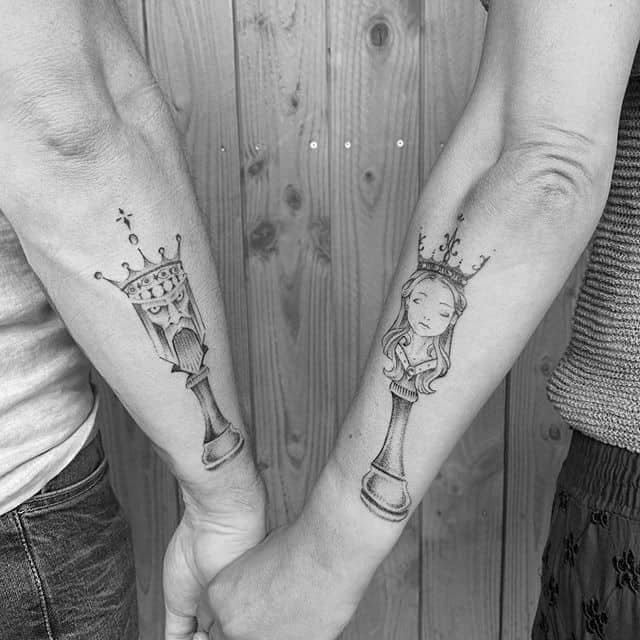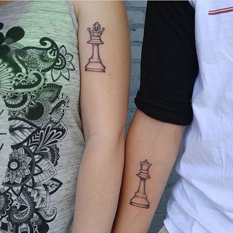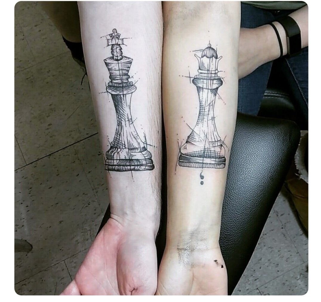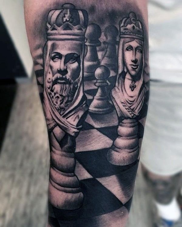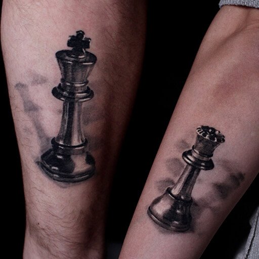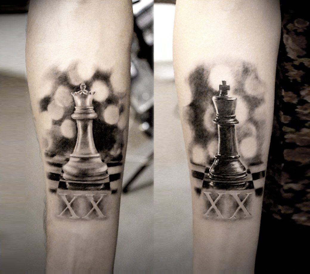 Ziemlich oft können Sie gepaarte Zeichnungen finden. Eine gute Option, um eine Schachskizze Tattoo zu ergänzen, sind denkwürdige Termine für Sie. Bei der Wahl der Farbe für diese Körperkunst fällt die Wahl meist auf Schwarz und Weiß. Aber es ist auch sehr interessant und farbenfroh.