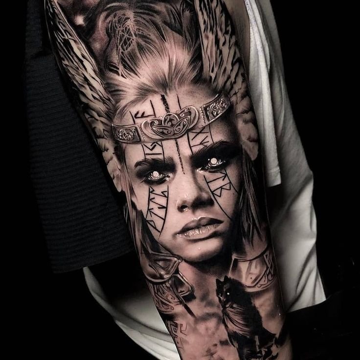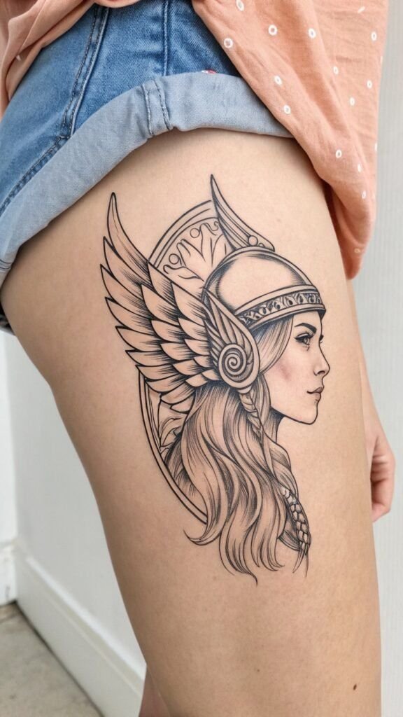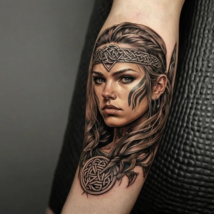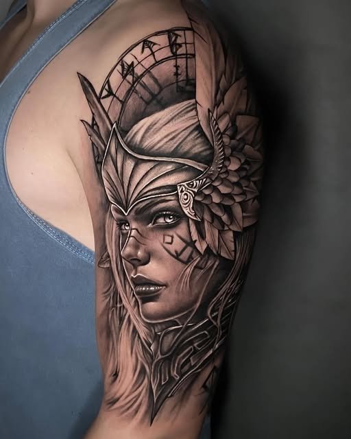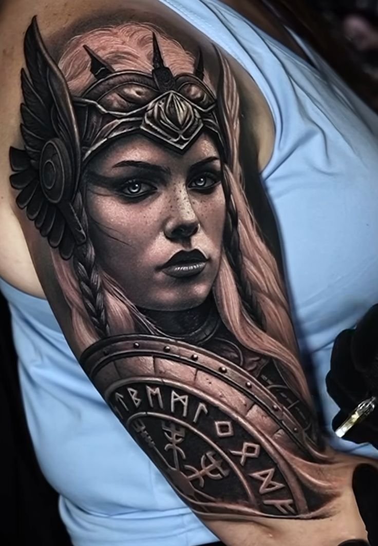Wenn du auf der Suche nach Inspiration bist, findest du unten Schildmaid-Tattoo Vorlagen in verschiedenen Stilen: von feinen Line-Art-Silhouetten bis zu realistischen Kampfporträts mit nordischen Ornamenten.