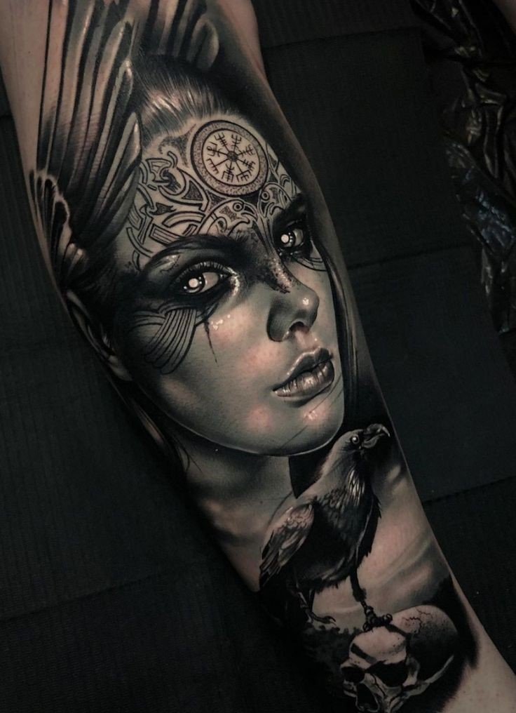 Beliebt sind auch Kombinationen mit Runen, Wölfen, Schwertern oder keltischen Knoten. Ob Blackwork, Dotwork oder Aquarellhintergrund – jedes Motiv kann deine persönliche Geschichte erzählen und dein Inneres nach außen tragen.