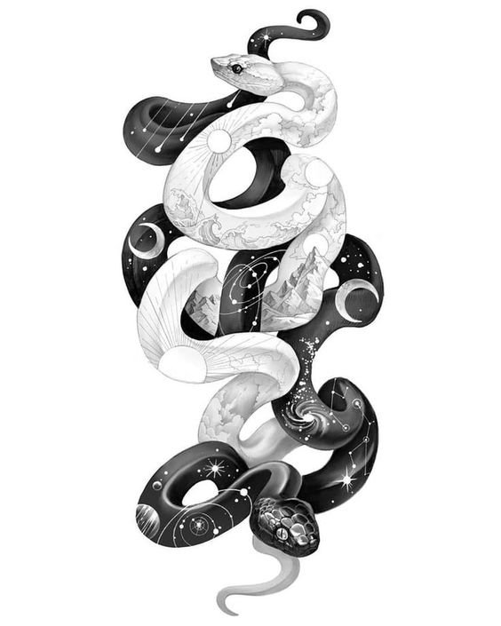 Es ist auch zu bemerken, dass die Schlange ein Zodiakalzeichen ist, das einen unter diesem Sternbild geborenen Mensch als weise und romantische Person beschreibt.Schlangen Tattoo ist universell, es ist unter Männern und Frauen gleichermaßen beliebt. Besonders eindrucksvoll sieht die Schlange auf dem weiblichen Körper aus, die die Körperkurven und die Sexualität der Inhaberin von Tätowierung unterstreicht. Schlangen sind in verschiedenen Stilen und Farben dargestellt. Es kann ein Schwarzweißbild sein oder mit bunten Farben gefüllt sein. Das Schlangen Tattoo im realistischen Stil sieht sehr beeindruckend aus und vermittelt das Geheimnis, die Schönheit und die Macht des Reptils. Jede Person hat individuelle Bevorzugungen. Haben Sie keine Angst vor Träumen, wählen Sie ein Schlangenbild aus und ergänzen Sie es mit von Ihnen bevorzugenden Elementen. Erstellen Sie für sich selbst eine individuelle Vorlage mit einer speziellen Bedeutung.