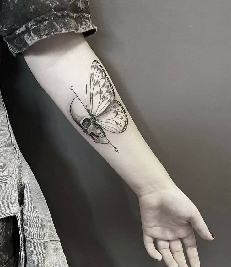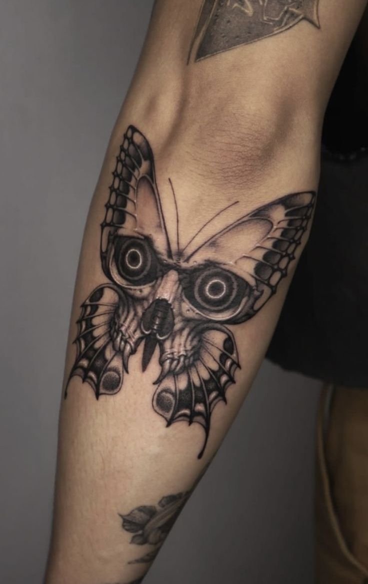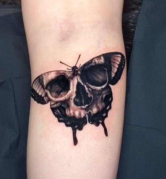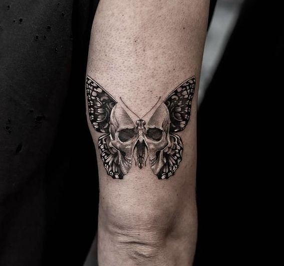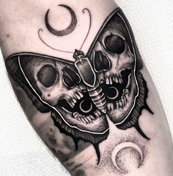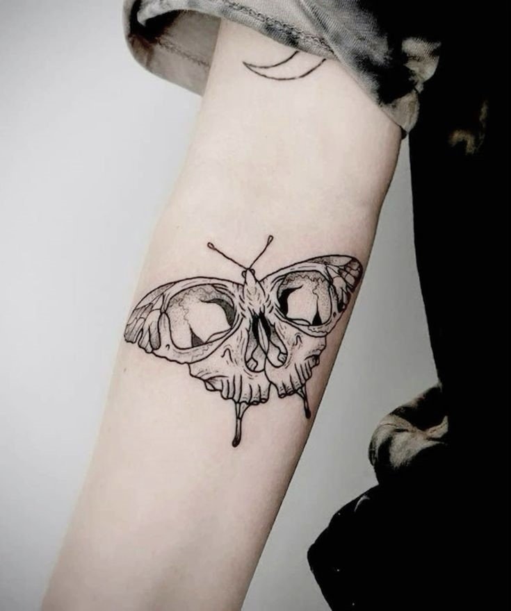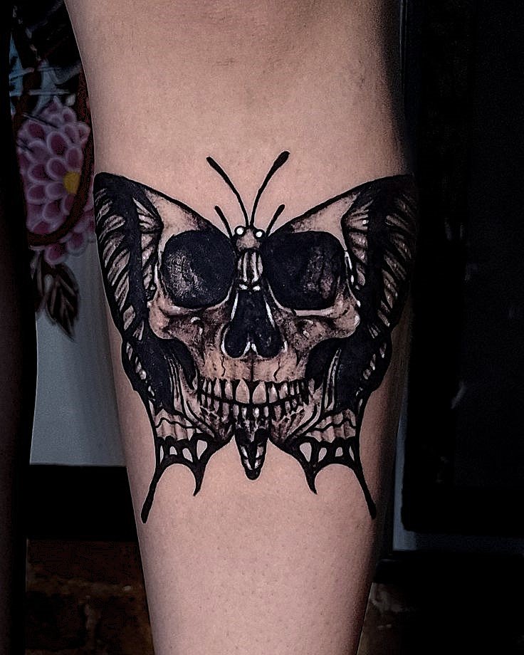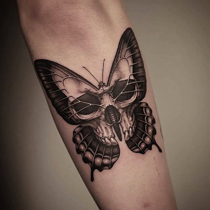 Die Bedeutung des Schmetterling mit Totenkopf Tattoos liegt in der spannenden Verschmelzung von Gegensätzen: zarte Leichtigkeit trifft auf symbolische Tiefe, Leben auf Vergänglichkeit.