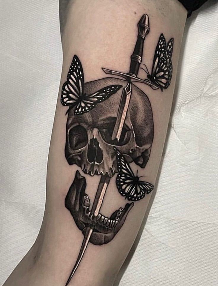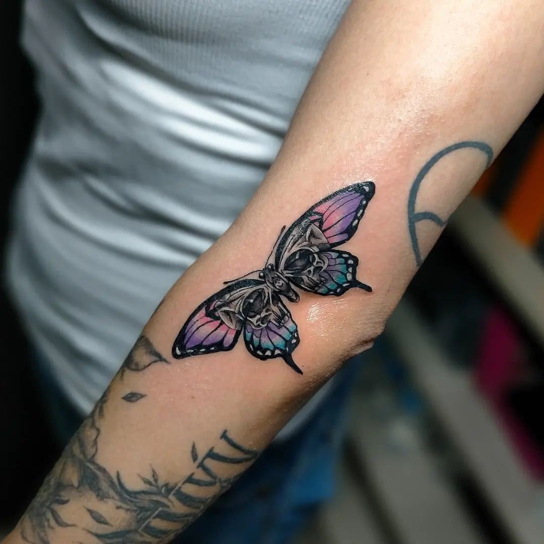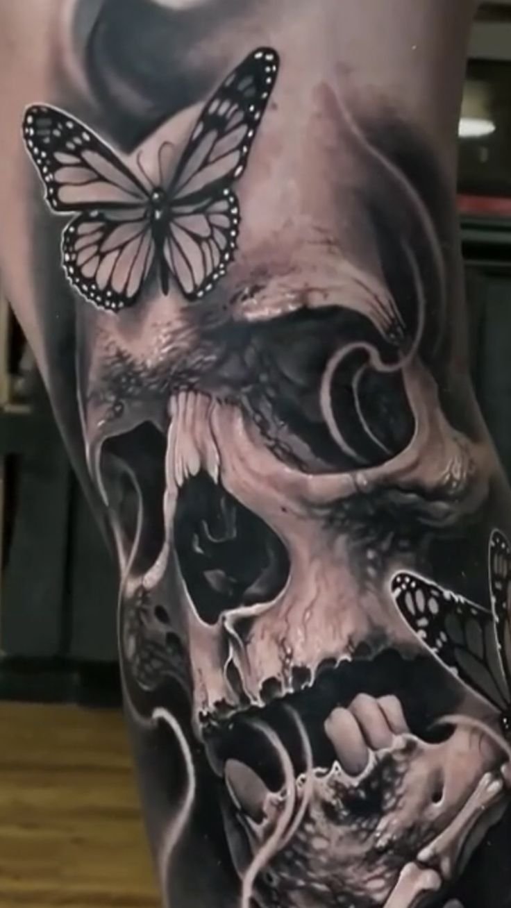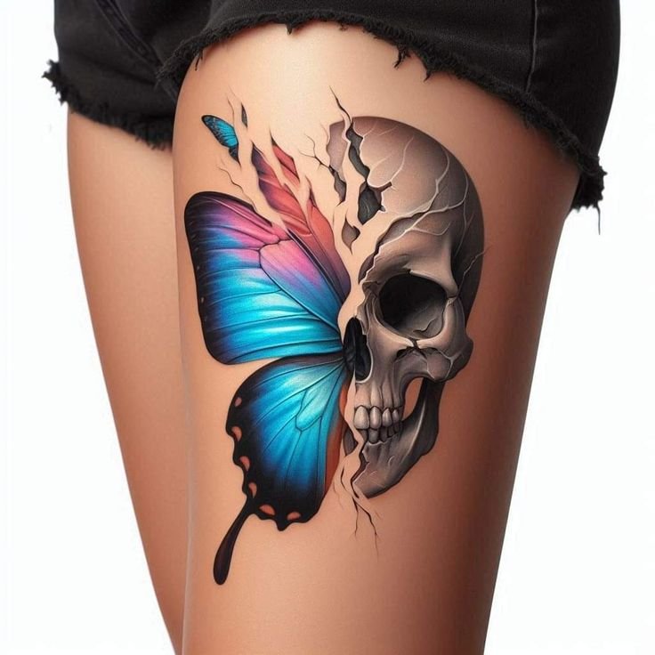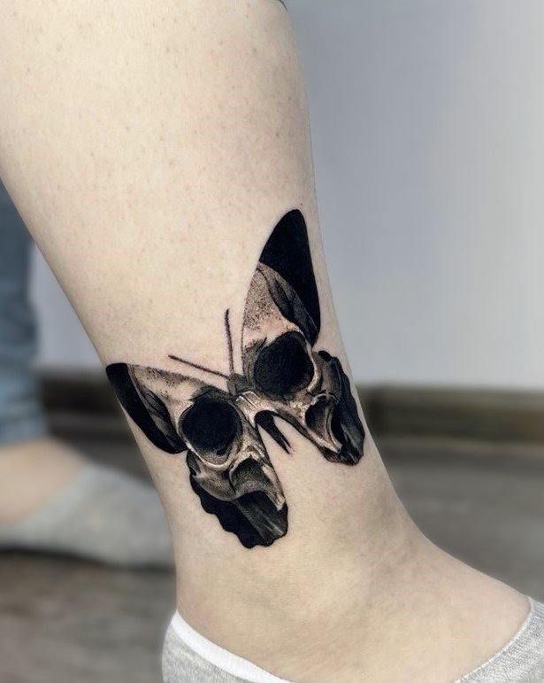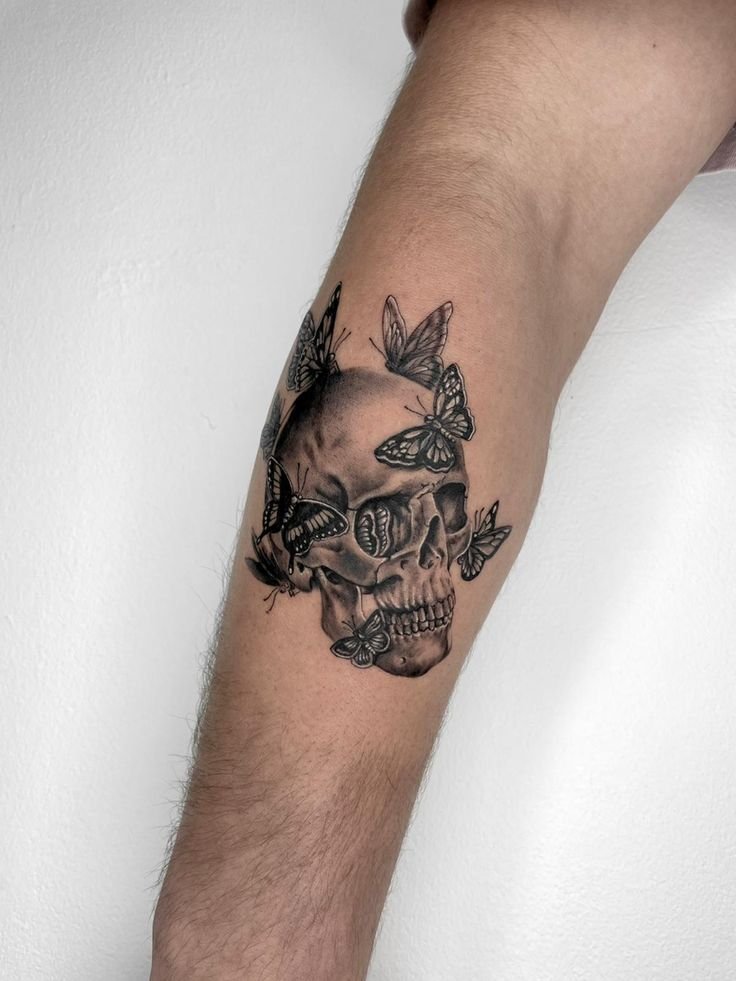 Die Bedeutung des Schmetterling mit Totenkopf Tattoos liegt in der spannenden Verschmelzung von Gegensätzen: zarte Leichtigkeit trifft auf symbolische Tiefe, Leben auf Vergänglichkeit.