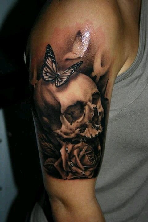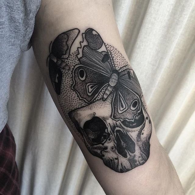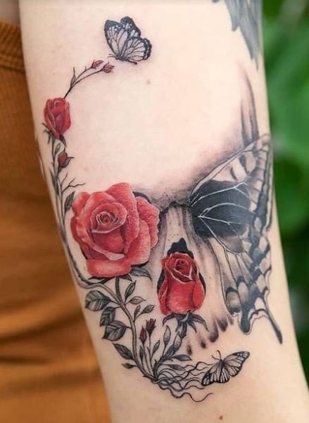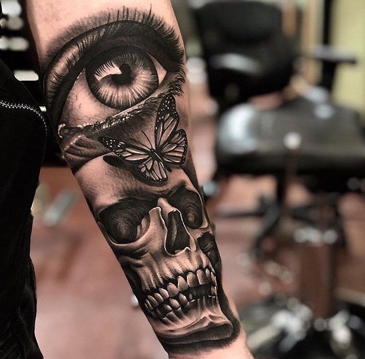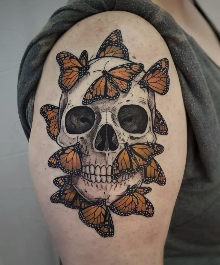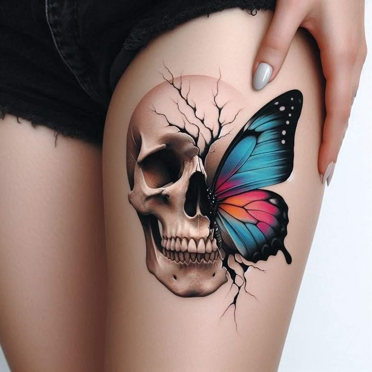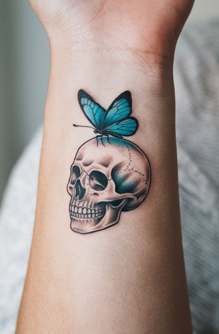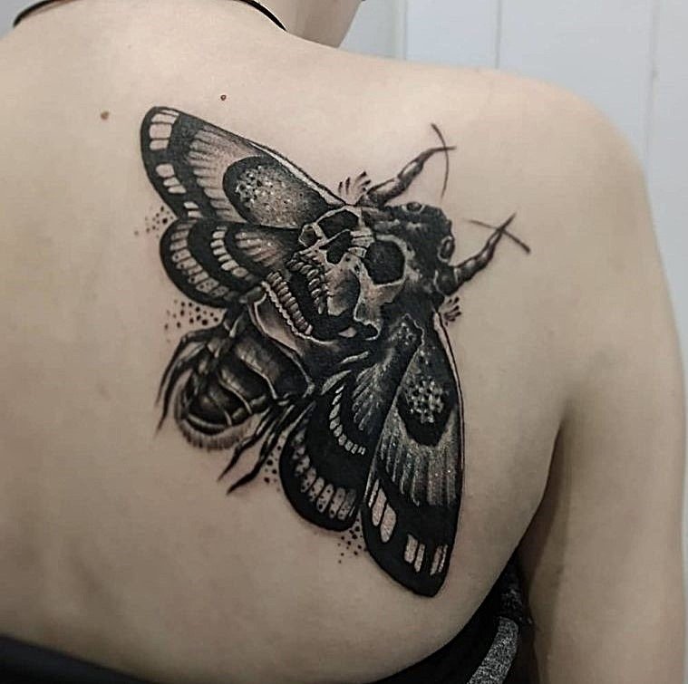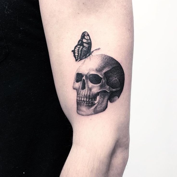 Die Bedeutung des Schmetterling mit Totenkopf Tattoos liegt in der spannenden Verschmelzung von Gegensätzen: zarte Leichtigkeit trifft auf symbolische Tiefe, Leben auf Vergänglichkeit.