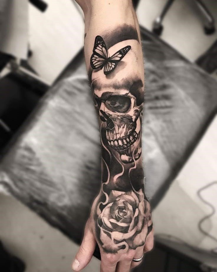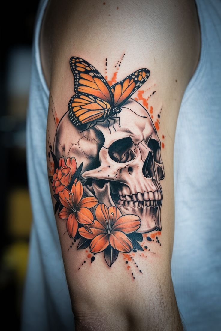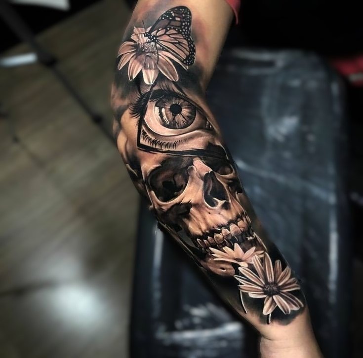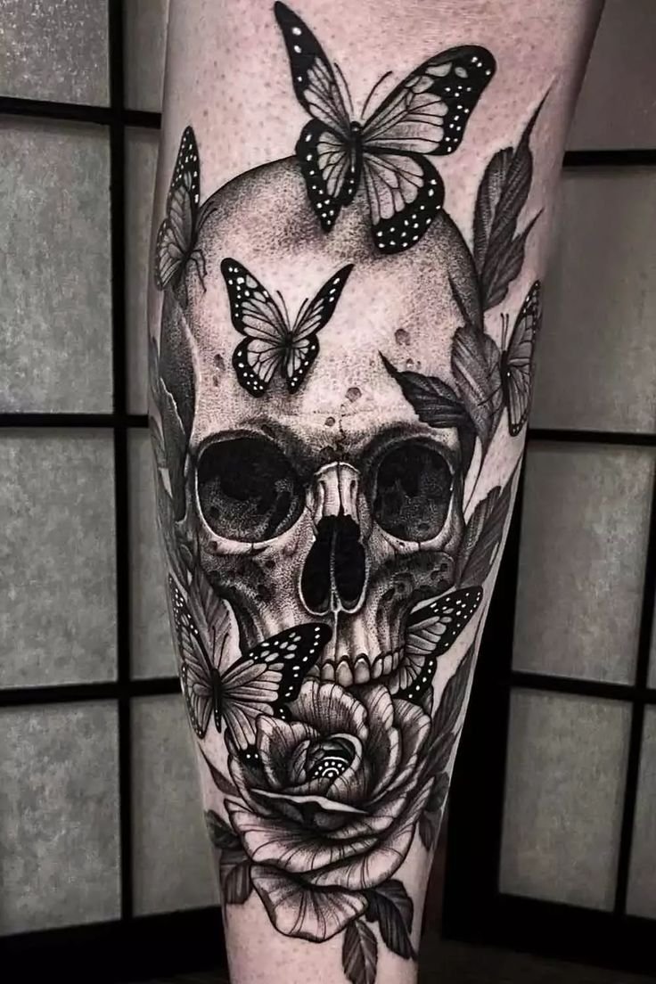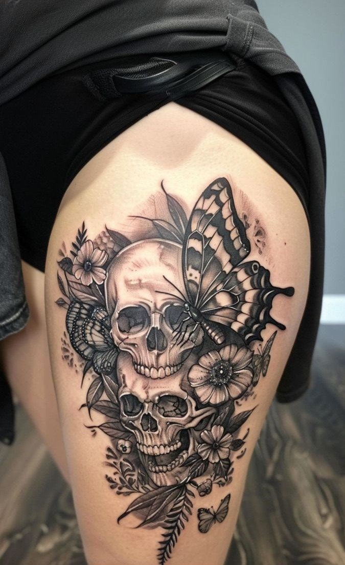 Der Totenkopf hingegen steht für Endlichkeit, Erinnerung und die bewusste Auseinandersetzung mit dem Tod. Wenn beide Motive in einem Tattoo verschmelzen, entsteht ein starkes Sinnbild: das Akzeptieren der Dualität des Lebens. Dieses Design repräsentiert die Schönheit des Wandels – mit all seinen Höhen und Tiefen. Besonders für Menschen mit bewegender Lebensgeschichte kann es eine Form der Selbstermächtigung darstellen.