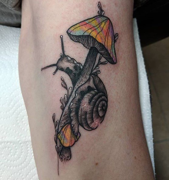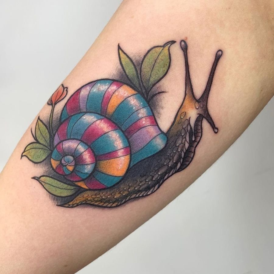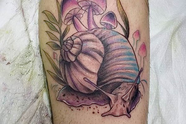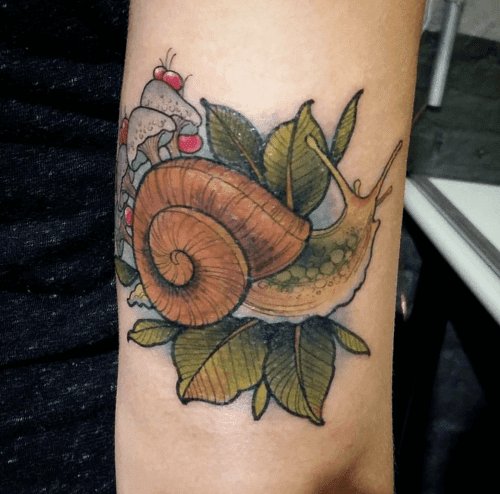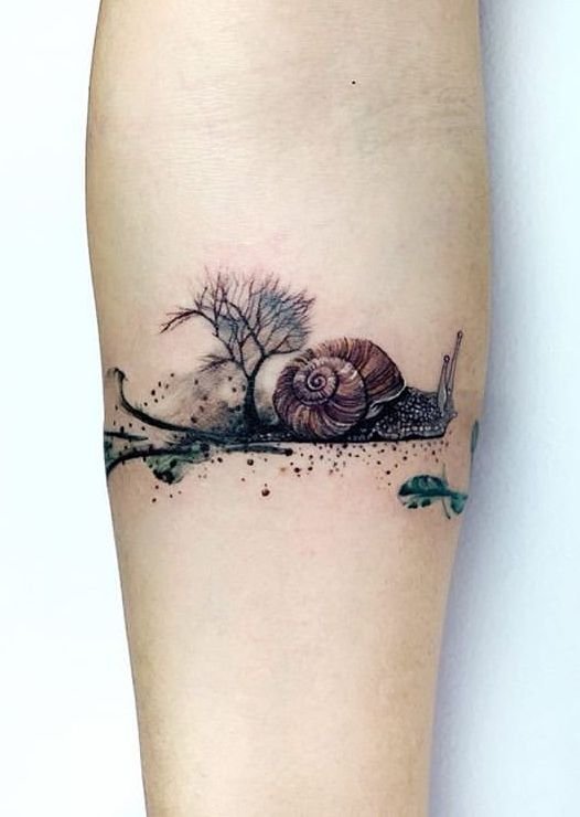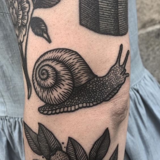 Oft wird das Schneckentattoo mit verschiedenen Elementen und Zeichnungen ergänzt, so dass ein ganzes Bild entsteht. Für diese Tätowierung werden Details wie Blumen, Blätter und oft ein kleines Haus anstelle einer Muschel verwendet.