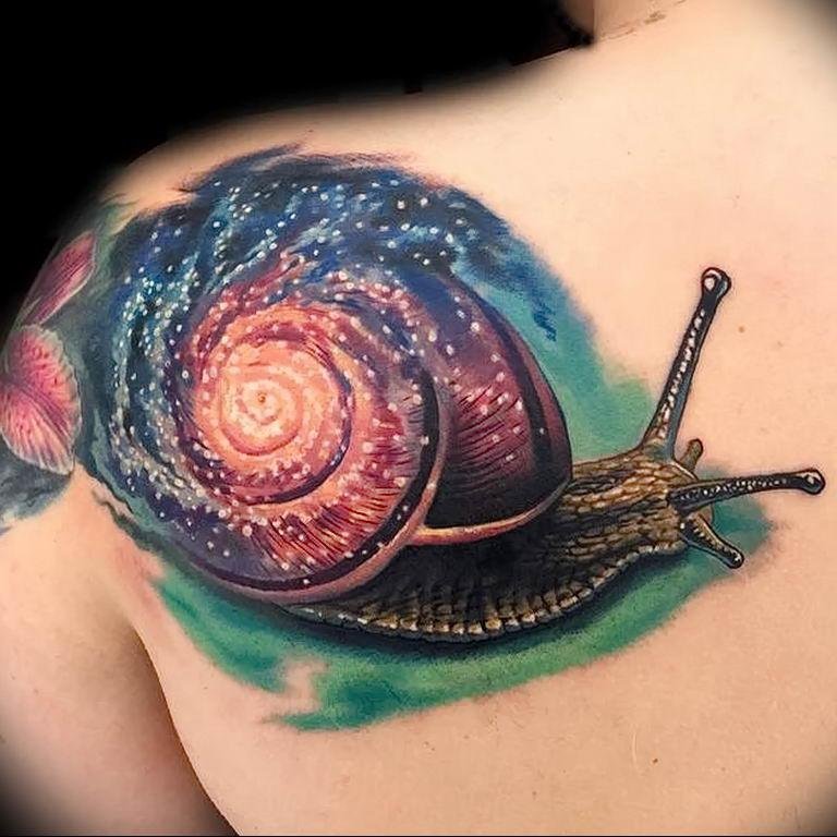 Meistens sind Schneckentätowierungen in hellen Farben dargestellt, aber nicht weniger selten kann man ein Tattoo in Schwarz und Weiß sehen. Auch eine gemeinsame Skizze der Schnecke im Cartoon-Genre, so dass das Tattoo noch heller und attraktiver.