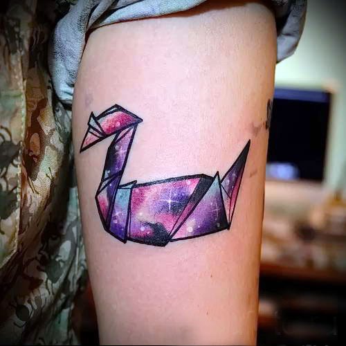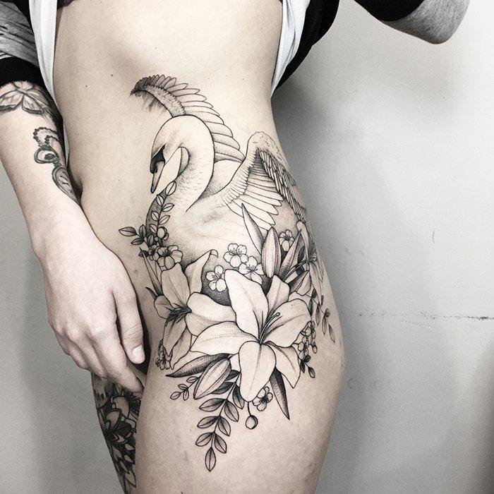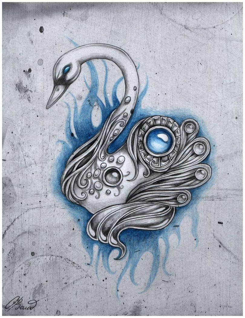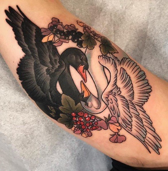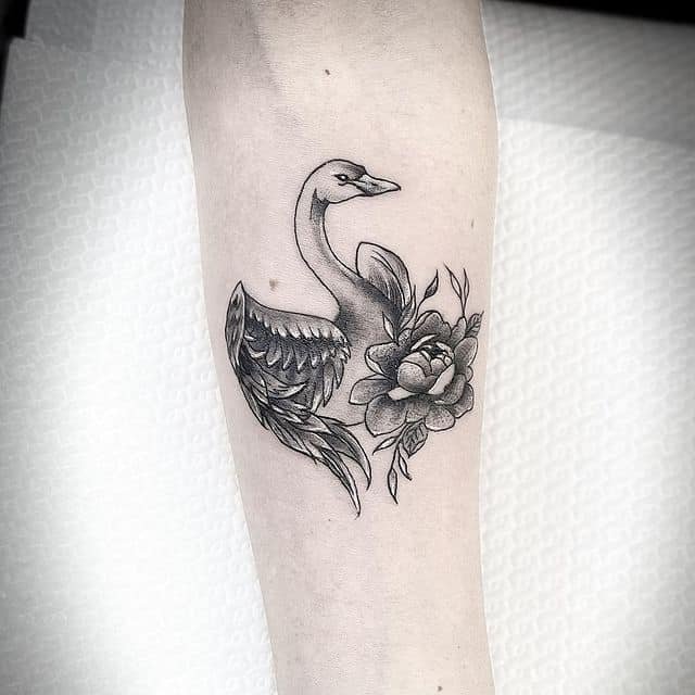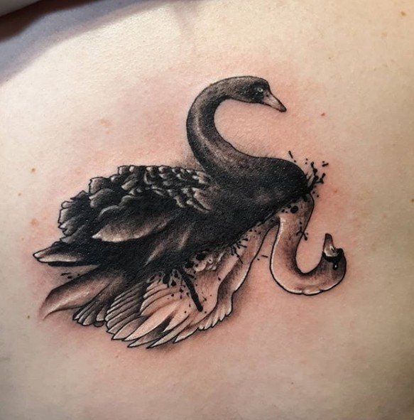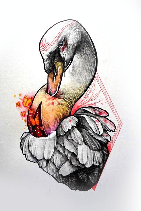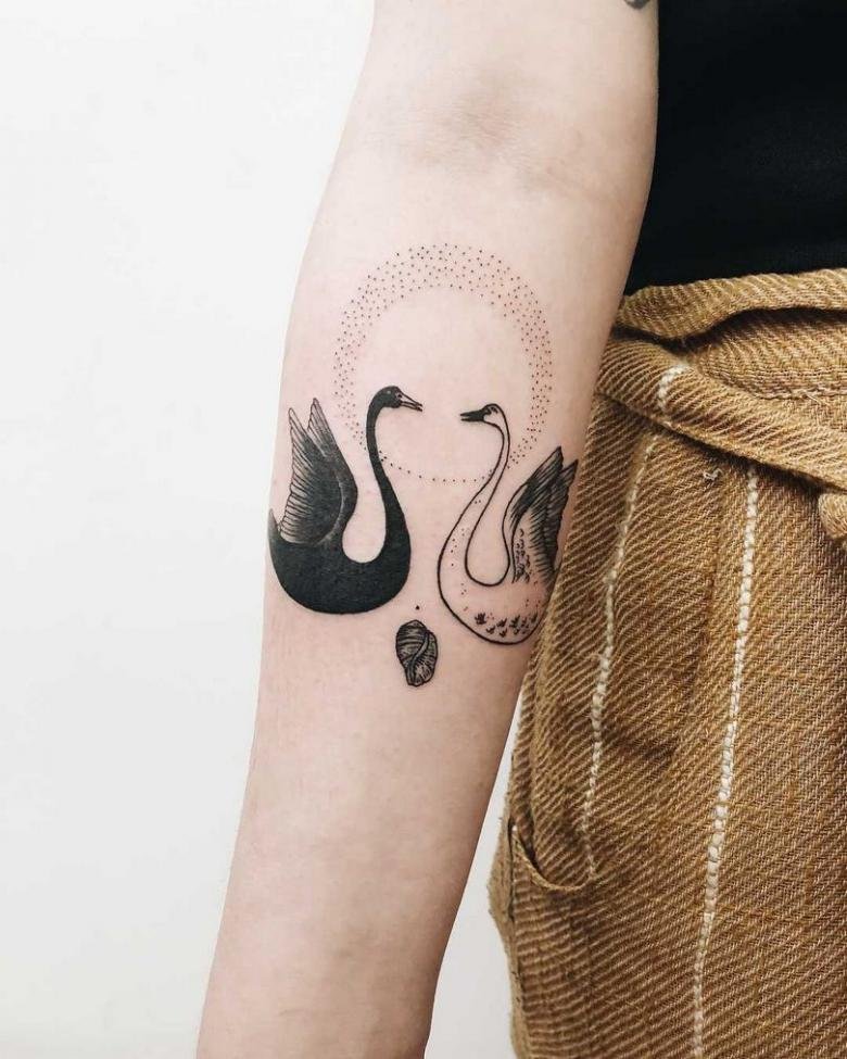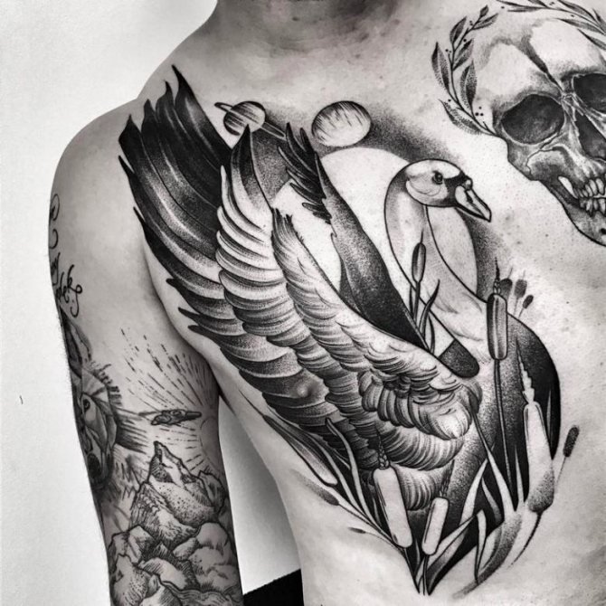 Wenn auf der Skizze ein Schwan ist, dann sprechen wir über ein trauriges Ereignis: Meistens ist es die Erinnerung an einen geliebten Menschen, vielleicht an unerwiderte Liebe. Das letzte Tattoo wird auch mit dem Namen eines geliebten Menschen durchgeführt. Es gibt eine Variante der Tätowierung, bei der der Schwan in Weiß gestochen wird, um seine Reinheit und Sauberkeit zu betonen. Ein schwarzer Schwan hingegen symbolisiert die magische Gabe seines Trägers. Insbesondere kann es ein Geschenk des Kunden sein, wenn er vorausschauend handelt.