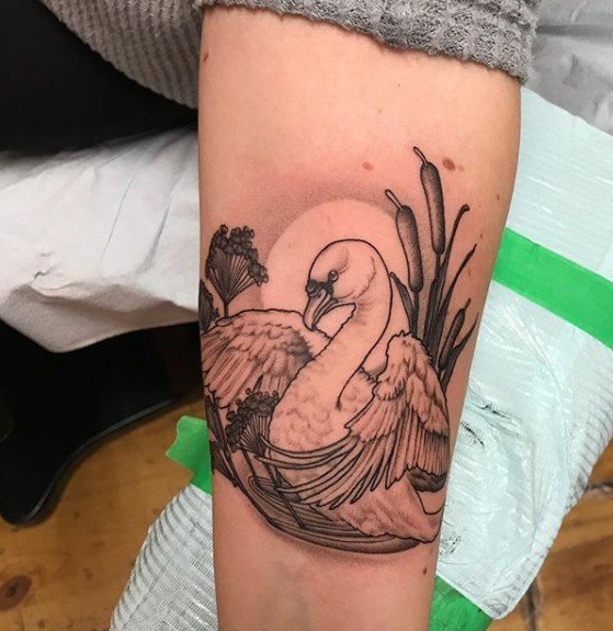 In diesem Fall können Sie einige dekorative Elemente wie Flora und Fauna hinzufügen. Es kann ein Laubwald auf dem Hintergrund eines Vogels sein, der See, wo es sich befindet, der Hintergrund kann Blumen sein, die Sonne. In jedem Fall sind helle Bilder hier besser geeignet, die die Arbeit ergänzen und betonen. Wenn wir es für eine traurigere Bedeutung halten, gibt es Beispiele für einsame Schwan-Tattoos auf einem kleinen Stück Land oder Wasser, um Einsamkeit anzuzeigen. Der Schwan wird am häufigsten auf die Haut aufgetragen, indem er auf Wasser schwimmt. Aber Jobs, bei denen es hoch hinausgehen kann, sind nicht ausgeschlossen; hier kommt es ganz auf Ihre Vorlieben an.