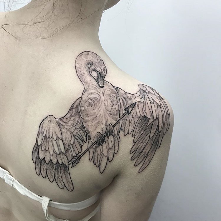 Es gibt eine negativere Bedeutung, wo der Schwan den Tod symbolisiert. Warum so? Alles nur, weil es eine Legende gibt, in der der Vogel vor seinem Tod sein letztes Lied spielt. Diese Interpretation wird jedoch äußerst selten verwendet. In den meisten Fällen hat das Schwan-Tattoo eine leichte und romantische Neigung.