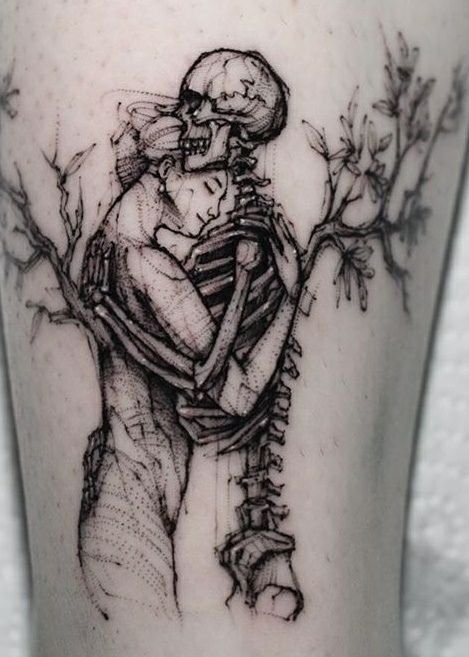 - Es ist auch eine ungewöhnliche Bedeutung des Skelett-Tattoos, das von den Alchemisten zu uns kam. Die Alchemisten glaubten, dass das Skelett eine Form der Wiedergeburt des menschlichen Körpers ist, wenn der Körper sich von der alten Hülle befreit und ein neues Aussehen annimmt.