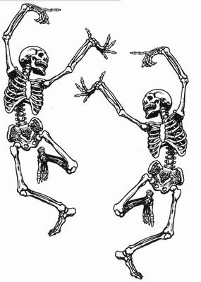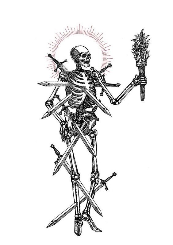 Es gibt auch oft Skizzen eines tanzenden Skeletts, eines Skeletts mit Karten oder einer Rose in den Händen.