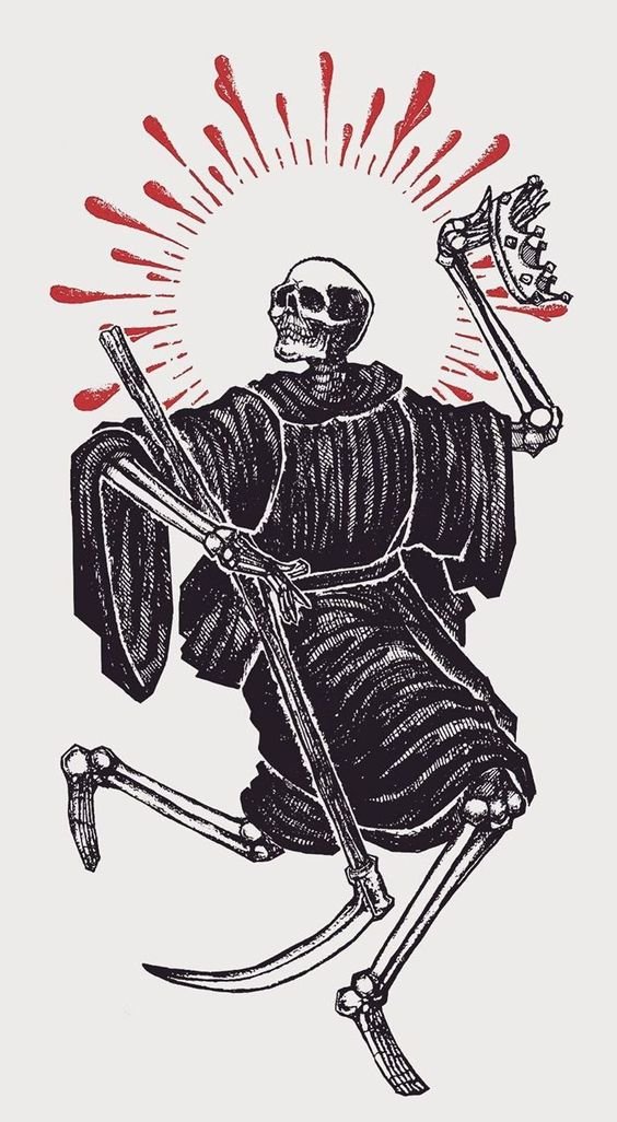 - Ein weibliches Skelett in einem Kleid, das eine Sense, eine Uhr oder eine Kugel hält. Santa Muerte ist die mexikanische Totengöttin, zu deren Ehren jedes Jahr ein Tag der Toten gefeiert wird. In Mexiko wird der Tag der Toten von Fröhlichkeit und Lachen begleitet, ohne jegliche negative Energie.
