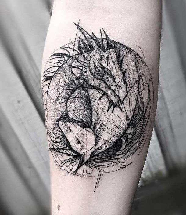 Es ist sozusagen der Hintergrund und die Basis für die Hauptzeichnung und passt auch gut zu anderen Stilen: Gothic, Oriental, Realismus, Old School.Tattoos in diesem Stil lassen sich leicht neu gestalten oder mit neuen Details ergänzen. Zum Beispiel, leuchtende Farben in die Komposition hinzuzufügen. Ein Bild mit einem sanften Übergang von einem Aquarell zu einem Sketch Style sieht eindrucksvoll aus. Ein grafisches Bild des Drachen im japanischen Stil wird eine Würze des Sketch Tattoos sein.