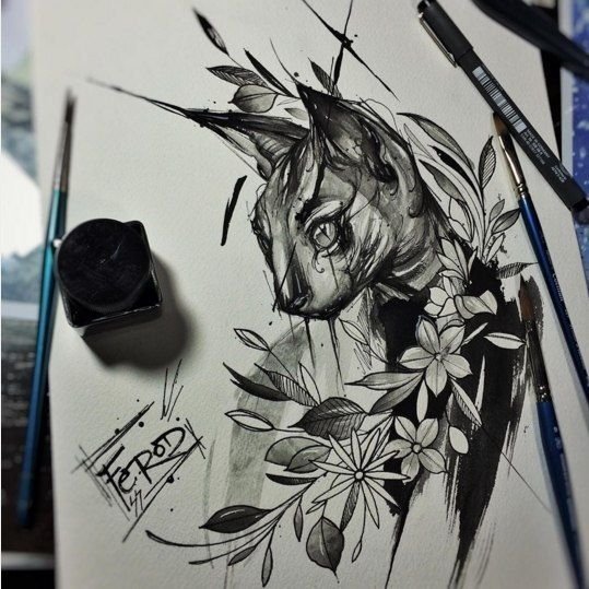 Der bekannteste Tätowierer in dieser Richtung lebt in Brasilien. Er heißt Frank Carrillo. In seiner Arbeit bevorzugt er die Verwendung von schwarzer Tinte und klaren geometrischen Formen. Der Tätowierer gesteht zu, dass ihm bei der Kommunikation mit dem Kunden Ideen und Inspiration einfallen. Sorgfältig auf die Geschichten und Überlegungen einer Person hörend, macht er ein bestimmtes Bild und bringt diesen Sinn in eine Tattoo ein. Kein Wunder, dass seine Tattoos wie ein lebendes Bild aussehen. Fotos seiner heutigen Arbeit sind ein Beispiel für einen idealen Sketch Style und zieren viele Tattoo-Studios.