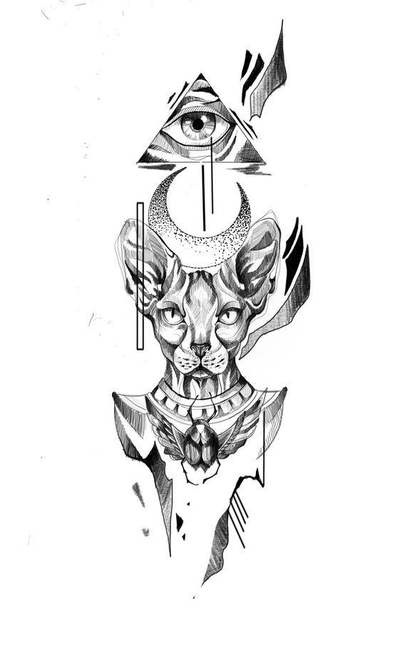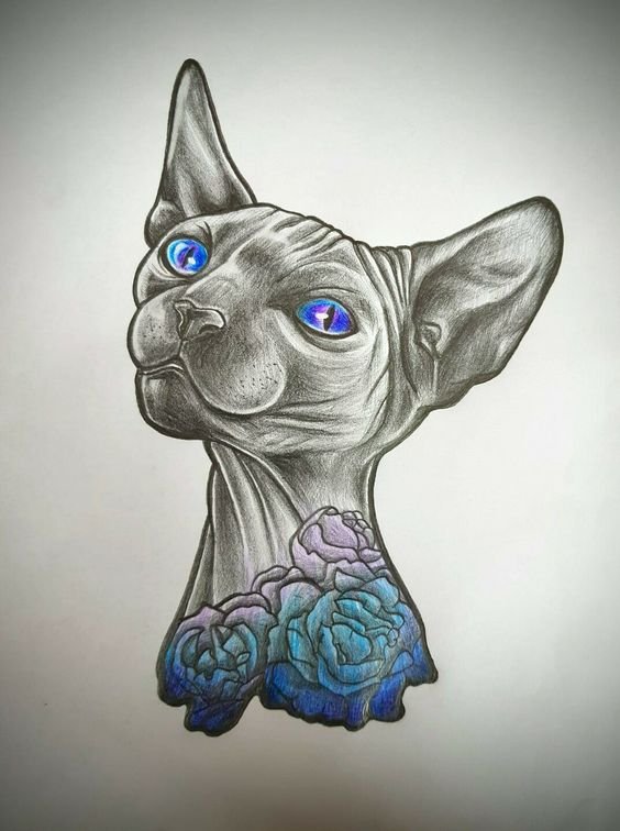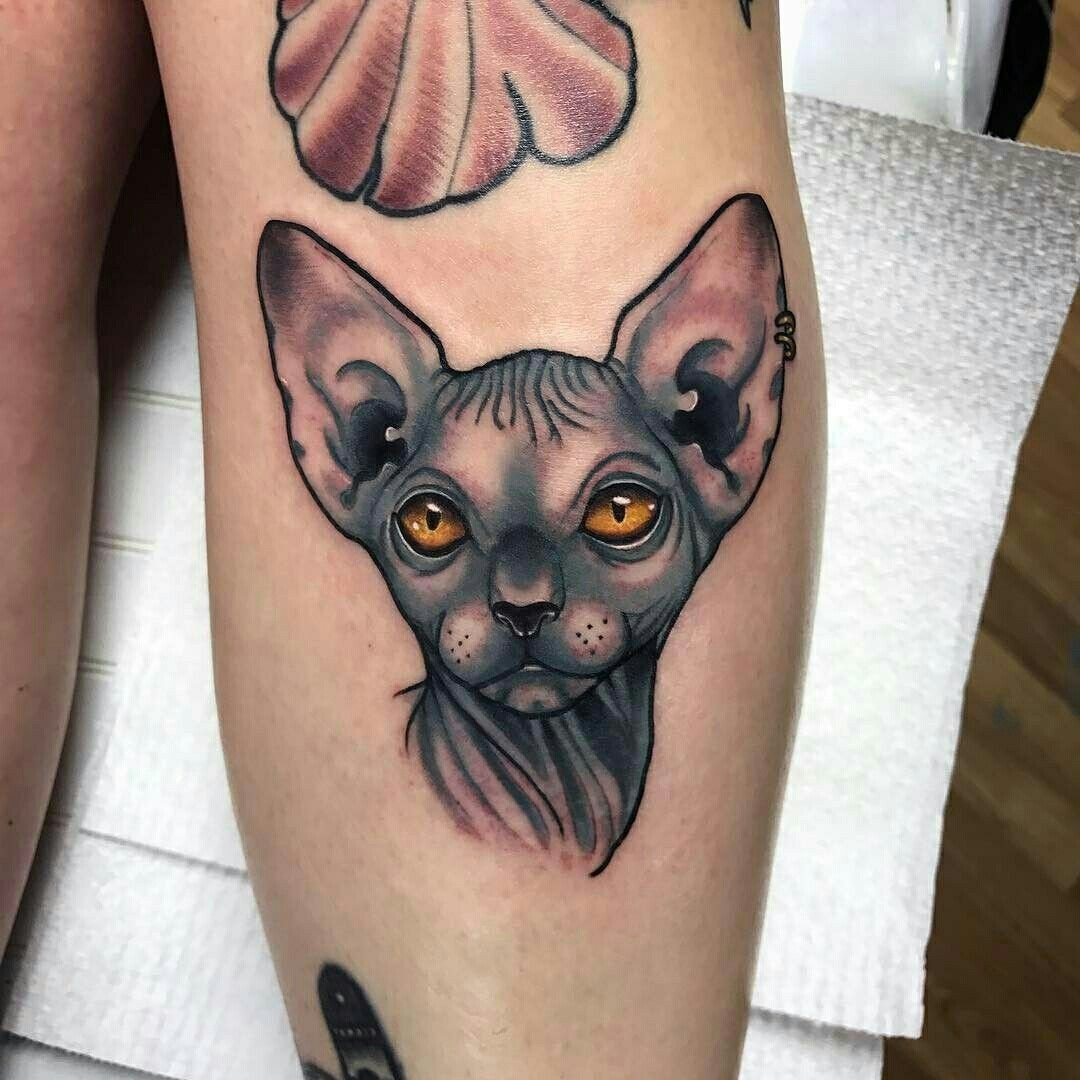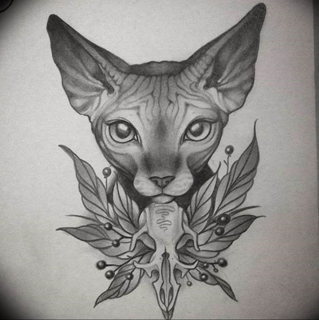 Tätowierungen mit Katzen dieser Rasse sind sowohl bei Frauen als auch bei Männer sehr gefragt. Viele Menschen denken, dass Sphinxe kahlköpfige Katzen sind, obwohl dass nicht der Fall ist. Der Körper dieser Katzenrasse ist mit Daunen bedeckt, manchmal auch mit kurzen Haaren. Ebenso ist ein beliebtes Missverständnis, dass Katzen Sphinxe böse und rachsüchtige Tiere sind. In der Tat sind es sehr süße Kreaturen, die ihren Meister lieben, die Wärme und Liebe lieben.