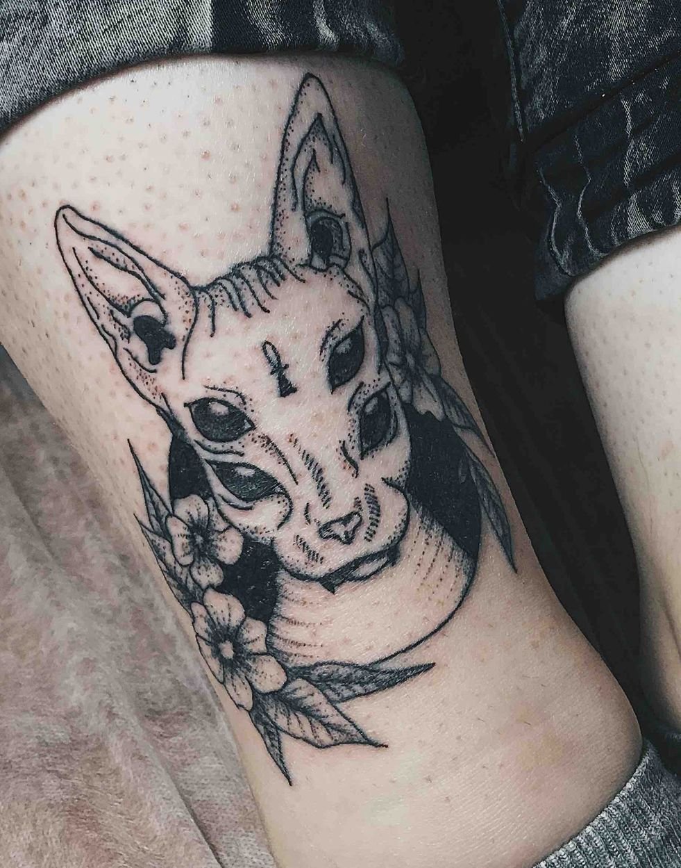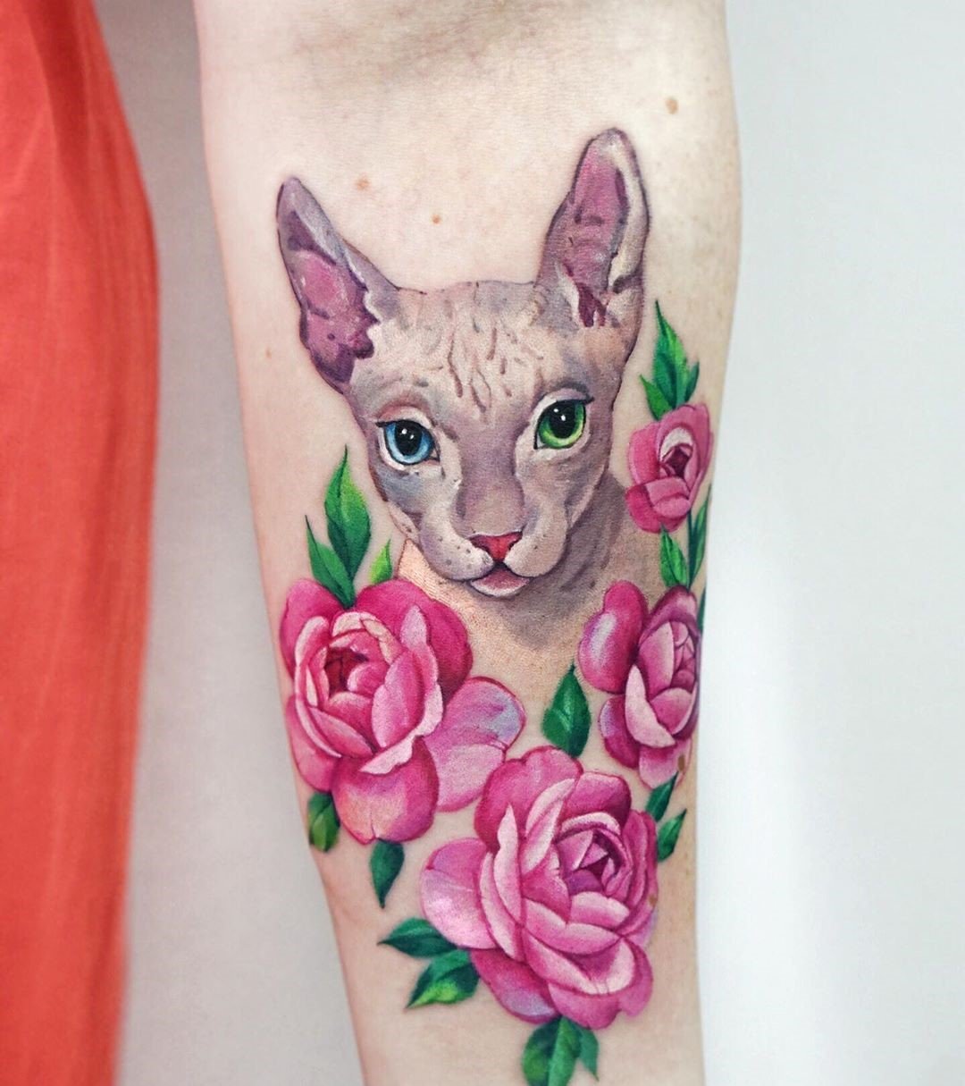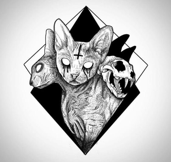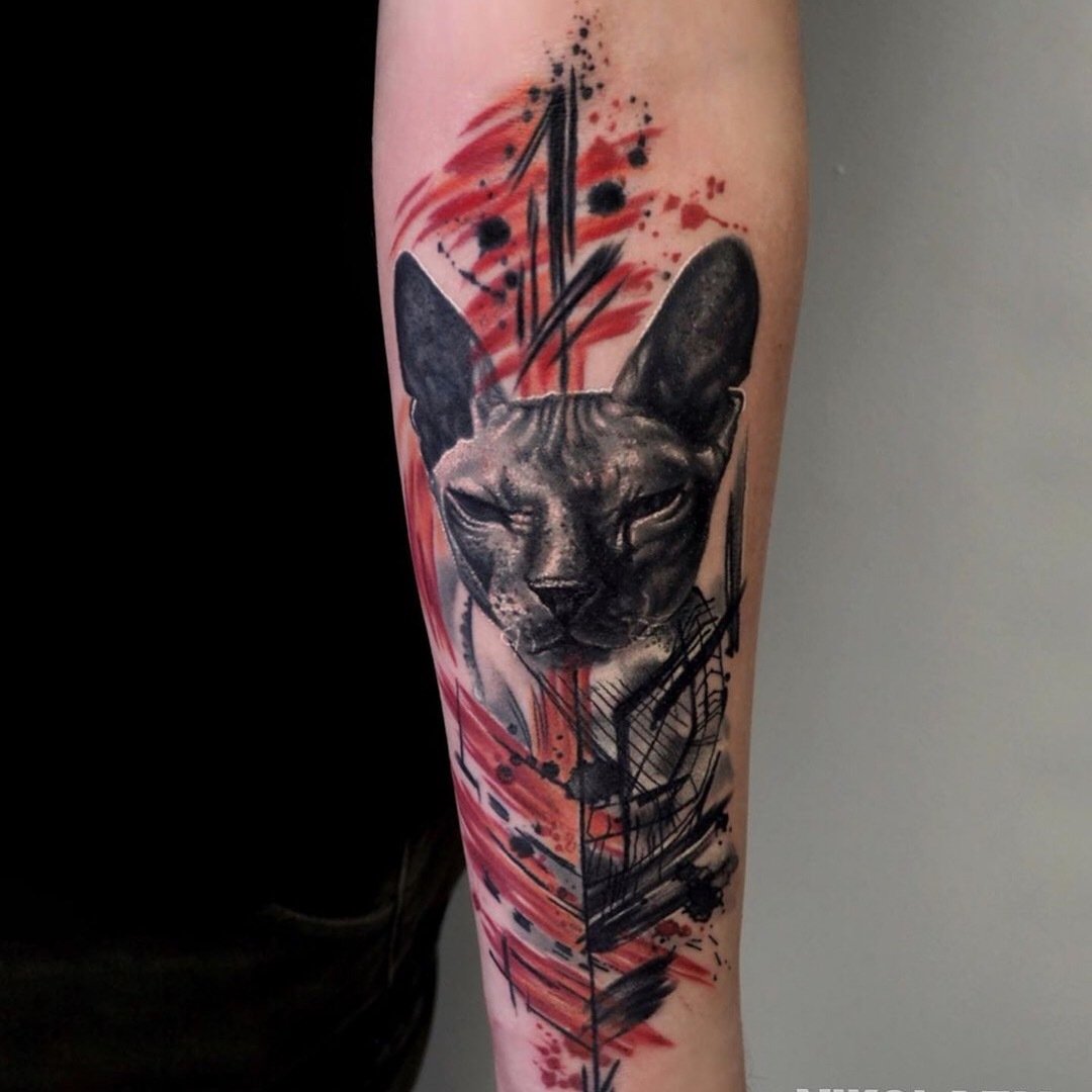 Tätowierungen mit Katzen dieser Rasse sind sowohl bei Frauen als auch bei Männer sehr gefragt. Viele Menschen denken, dass Sphinxe kahlköpfige Katzen sind, obwohl dass nicht der Fall ist. Der Körper dieser Katzenrasse ist mit Daunen bedeckt, manchmal auch mit kurzen Haaren. Ebenso ist ein beliebtes Missverständnis, dass Katzen Sphinxe böse und rachsüchtige Tiere sind. In der Tat sind es sehr süße Kreaturen, die ihren Meister lieben, die Wärme und Liebe lieben.