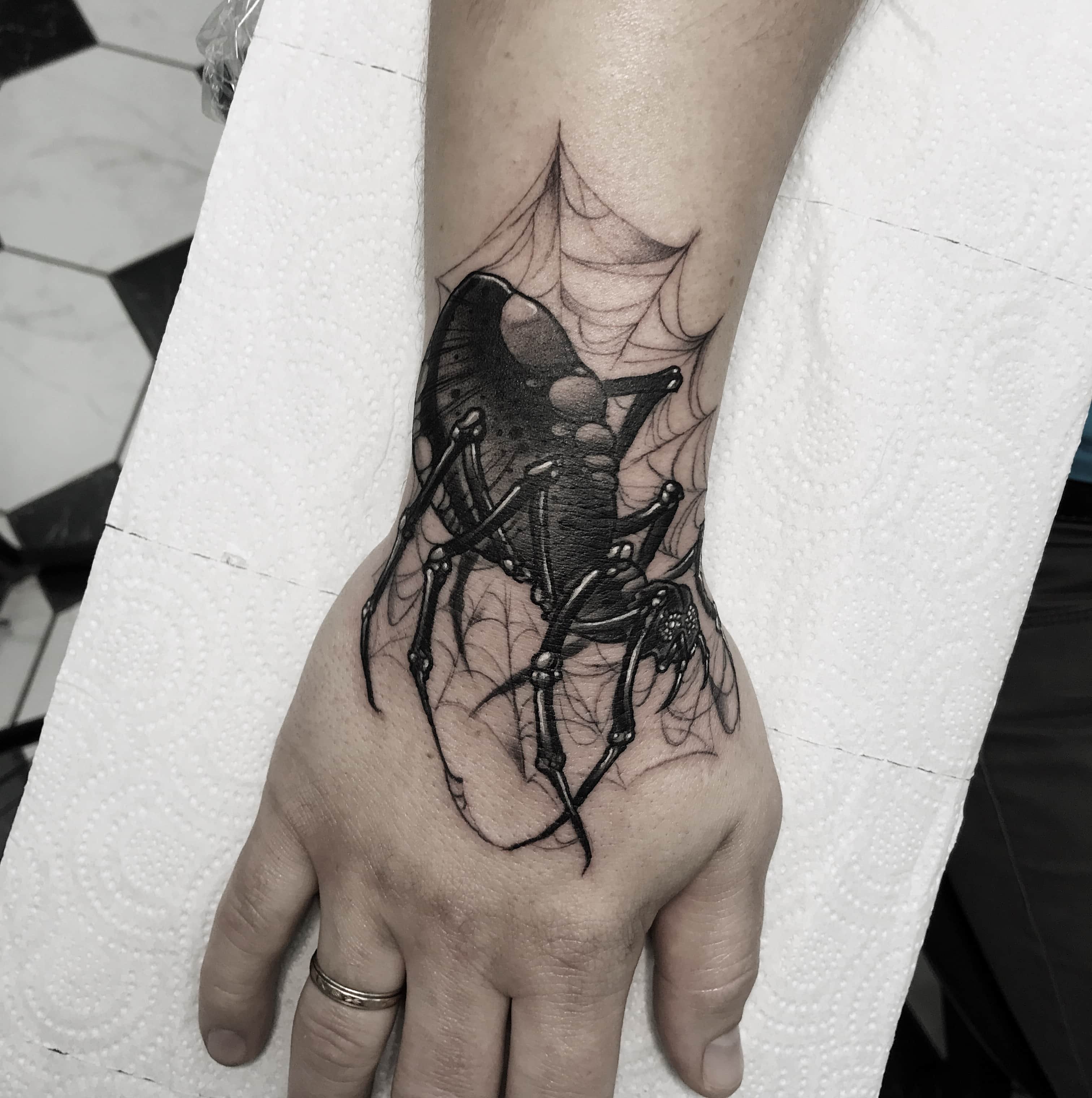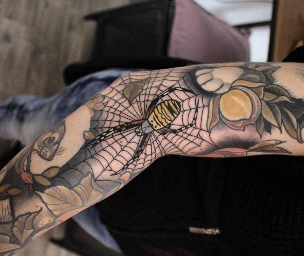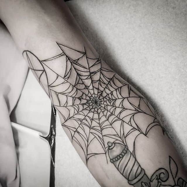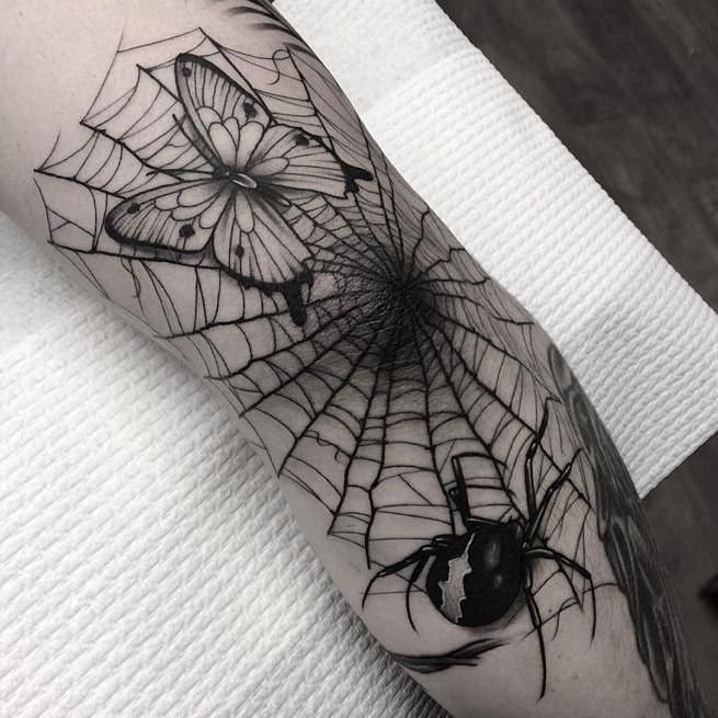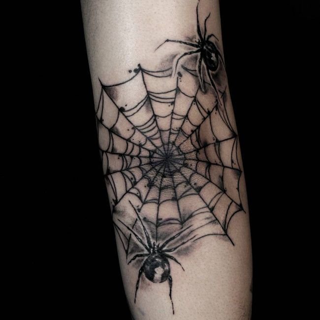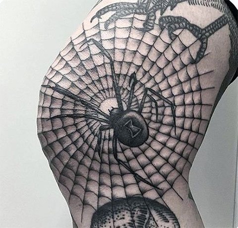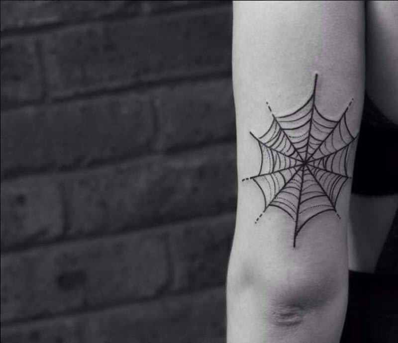 Der Ort für die Zeichnung des Spinnennetzes kann beliebig gewählt werden: ein Ellbogen, Handgelenk, Hals, hinter dem Ohr, Schulter und so weiter. Sowohl als Einzelmotiv als auch mit zusätzlichen Elementen sieht das Spinnennetz-Tattoo immer attraktiv, spektakulär und ungewöhnlich aus und unterstreicht so den individuellen Stil seines Trägers.
