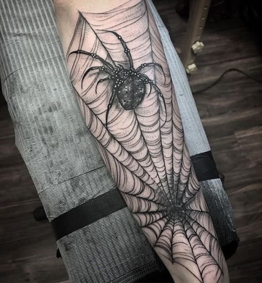 Tattoo mit dem Bild des Spinnennetzes sieht ziemlich spektakulär aus, viele Spinnennetze schaffen visuell Volumen, so dass das Tattoo ziemlich realistisch aussieht.