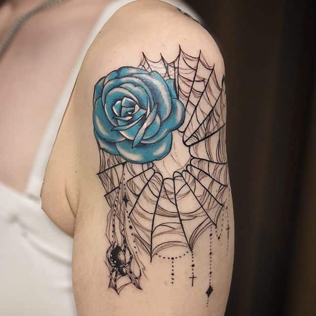 Ein Netz-Tattoo auf der Schulter einer Frau zeigt den Mut der Trägerin sowie ihre Hingabe und Unabhängigkeit.