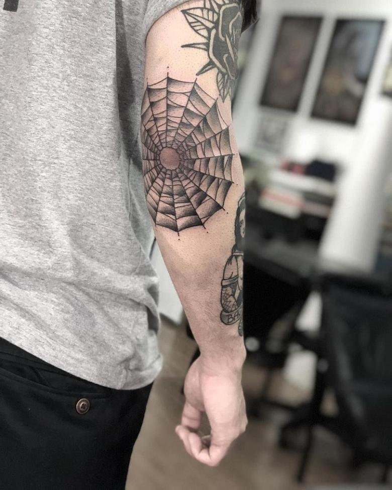 Die Skizze eines Spinnennetzes wird am häufigsten von Männern gewählt, die es als separates Tattoo und mit zusätzlichen Elementen in Form einer Spinne, einer Fledermaus, eines Totenkopfes usw. füllen.