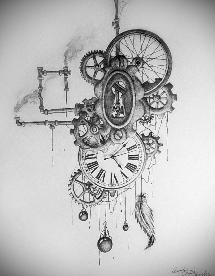 Solche Tattoos erinnern ein wenig an die Biomechanik: Mechanische Teile, Zifferblätter, Zahnräder sind durch einen lebenden Körper sichtbar, als ob die natürlichen Körperteile durch künstliche ersetzt worden wären.
