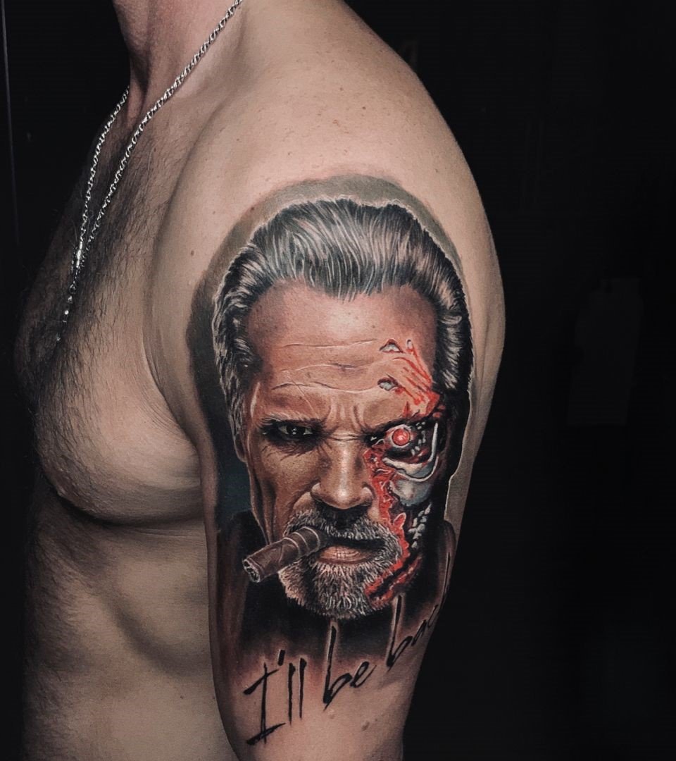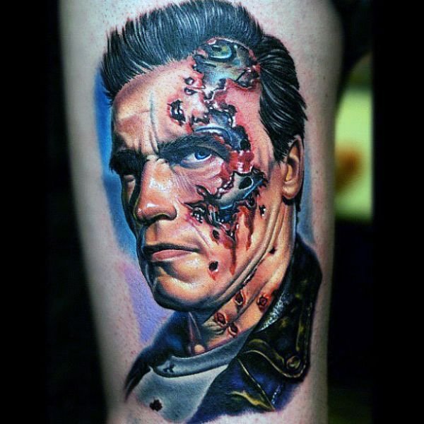 Nicht weniger populärer Stil gilt als Realismus. Denn sehr natürlich und realistisch können die Meister sogar Aufnahmen aus dem Film darstellen. In der Handlung des Films wurde das Gesicht des Terminators beschädigt, so dass die mechanischen Details und das Laserauge auf dem Körper sehr cool aussehen. Tätowierungen dieser Art erfordern viel Erfahrung und Professionalität vom Handwerker.