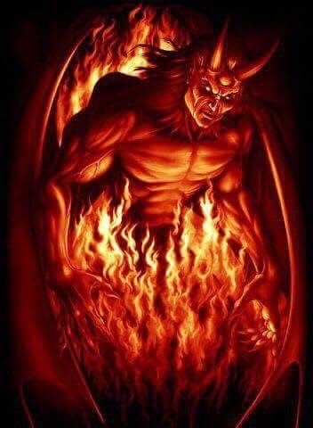 Üblicherweise wird der Teufel in einem leuchtenden Rotton dargestellt, umgeben von lodernden Flammen.
