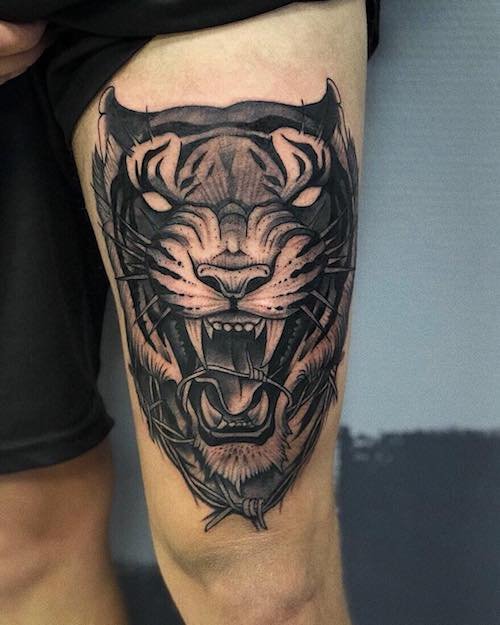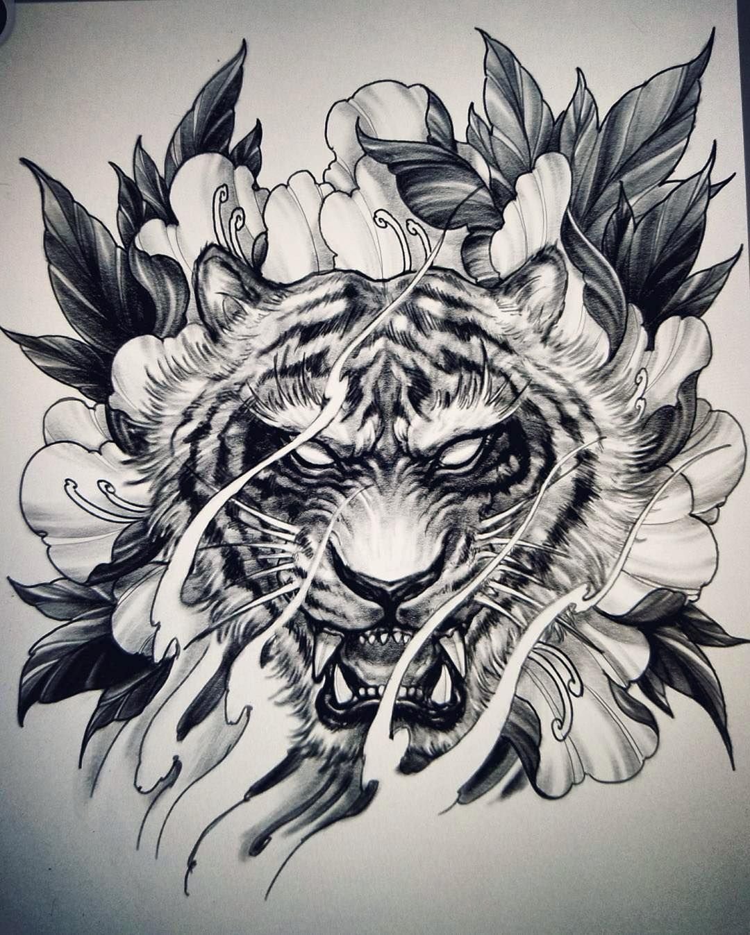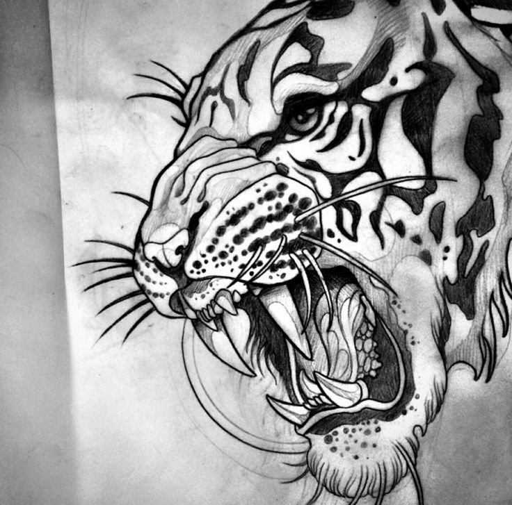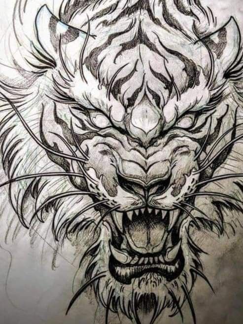 - Die Tigerskizze mit einem Grinsen deutet auf eine überhebliche Person hin und darauf, dass der Träger der Tätowierung von seinen Feinden nicht verschont wird.