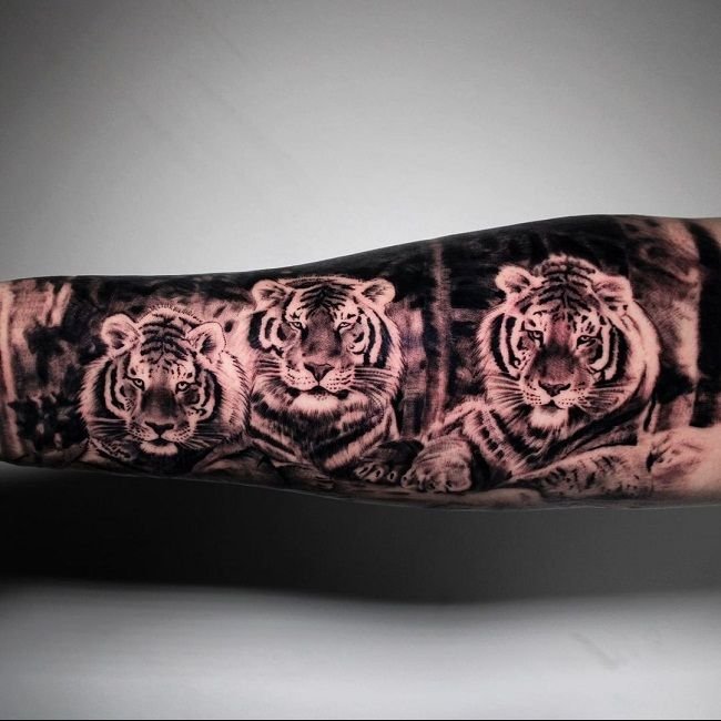 In der Regel wird das Tiger-Tattoo am häufigsten im Stil des Realismus dargestellt, das Tier kann ruhig unter der Sonne liegen, kann sich schleichen, seine Pfote lecken oder einfach nur auf dem Hintergrund der natürlichen Umgebung sitzen. Alles hängt von der Phantasie des Tattoo-Meisters ab, sowie von den Wünschen des Kunden selbst.
