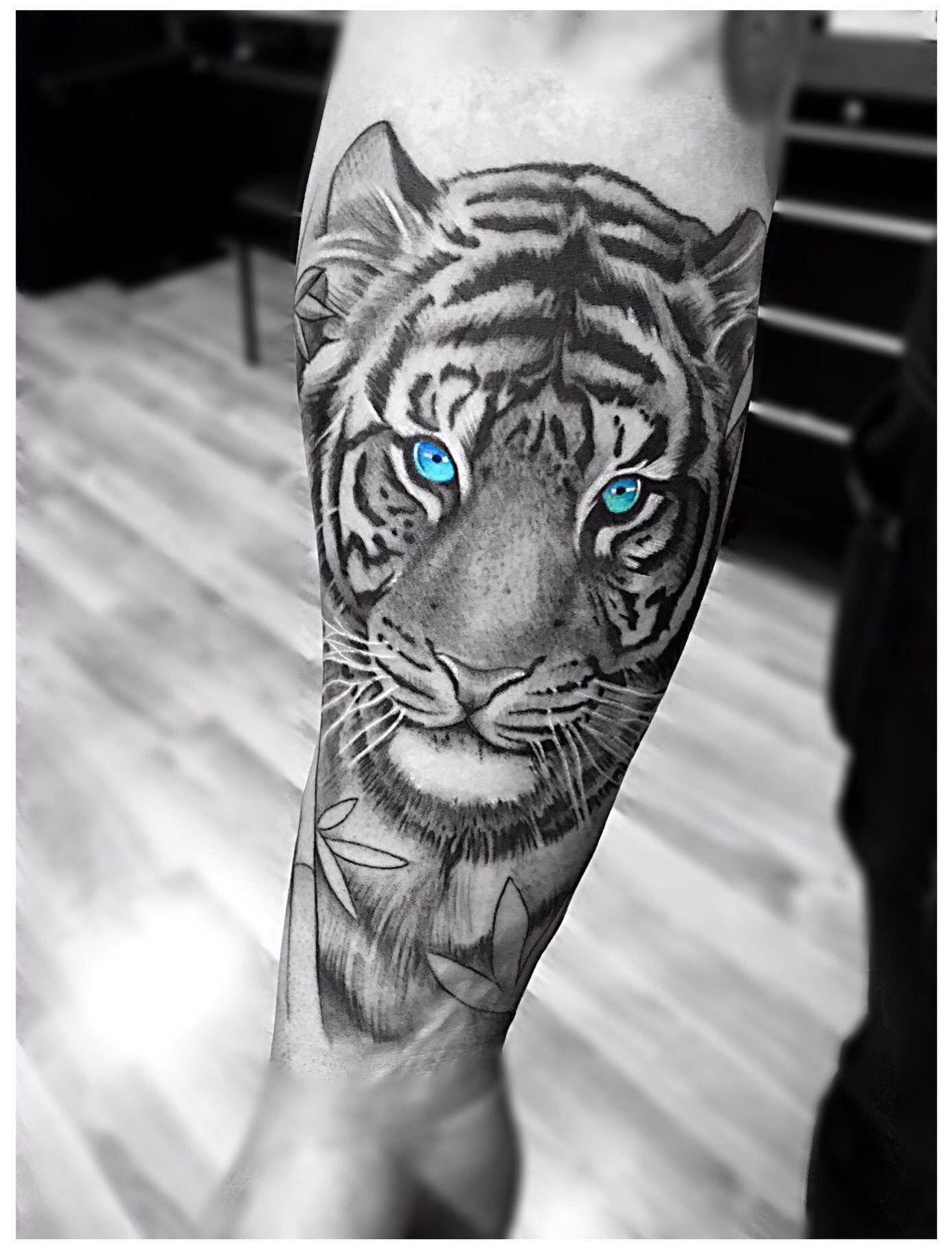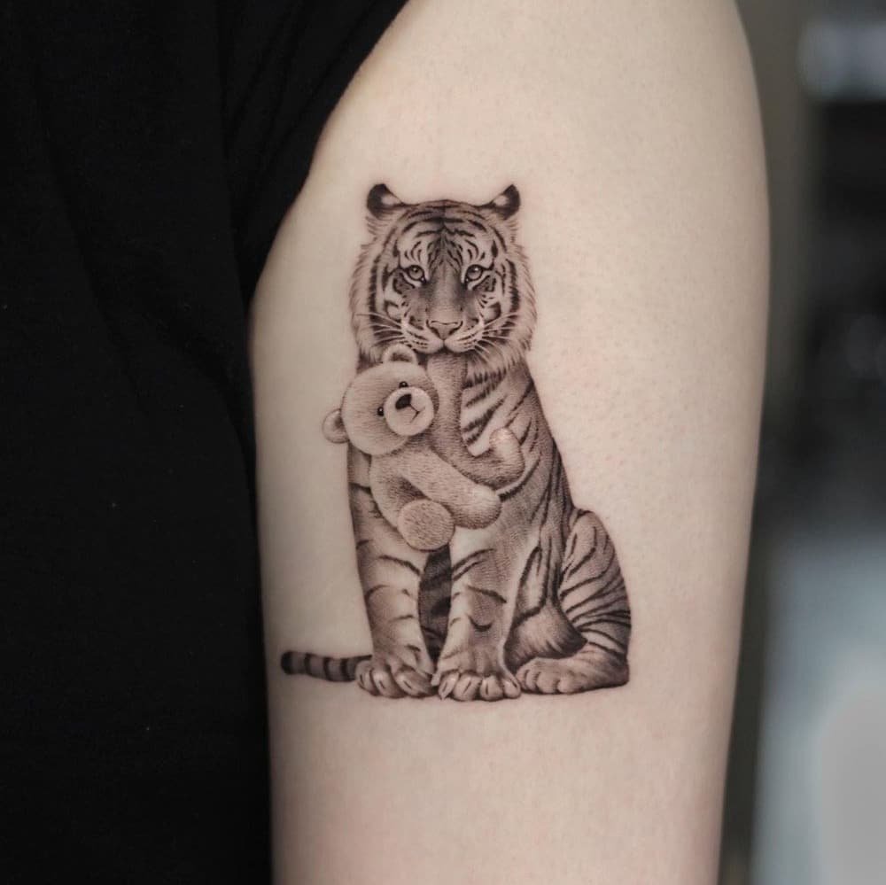 - Die Tätowierung eines Tigers in einem ruhigen Farbschema steht für Entschlossenheit, Ausdauer, Widerstandsfähigkeit, innere Stärke und einen starken Charakter.