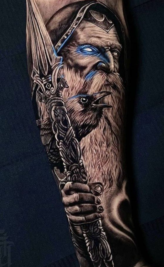 Die einfarbigen Wikingertätowierungen, die in den Farben Schwarz und Marineblau gehalten sind, enthalten oft mehrere grafische Elemente. Die farbigen Tätowierungen bestehen oft aus einem großen, komplexen Bild. Jeder findet das richtige skandinavische Tattoo aufgrund der Vielfalt der Variationen.