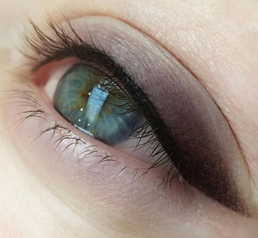 - Schattenimitation ist eine ziemlich komplexe Art der Pigmentierung, die viele Übergänge von der Farbe zur Farbe erfordert. Das Hauptziel des Permanent makeup -Artisten ist eine solche Wirkung zu erreichen, dass diese Art von Permanent Make-up natürlich aussieht. Mit dieser Technik kann man die Form der Augen runder oder länger machen. Auch verbirgt ein solches Permanent Make-up die Falten auf den Augenlidern und solche Defekte wie Narben oder Striemen.