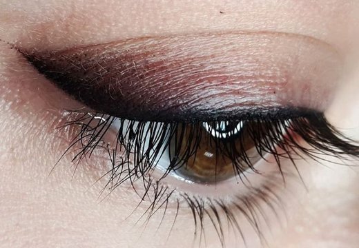 - Die nach unten gerichteten Augenwinkel werden durch die Lidstriche, die sich sanft von einer dünnen zu einer dickeren Linie übergehen, korrigiert.